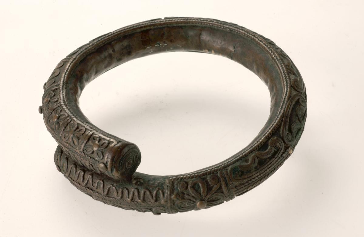 This is an elaborately crafted gold bangle with a ribbed outer surface and smoothly finished inner circumference. A pair of finely sculpted peacocks flanks the screw which is seen in the form of a spire akin to the tower of a south Indian temple. Bangles such as these would have been made to be presented by royalty to scholars, artists, etc as a sign of imperial honour.