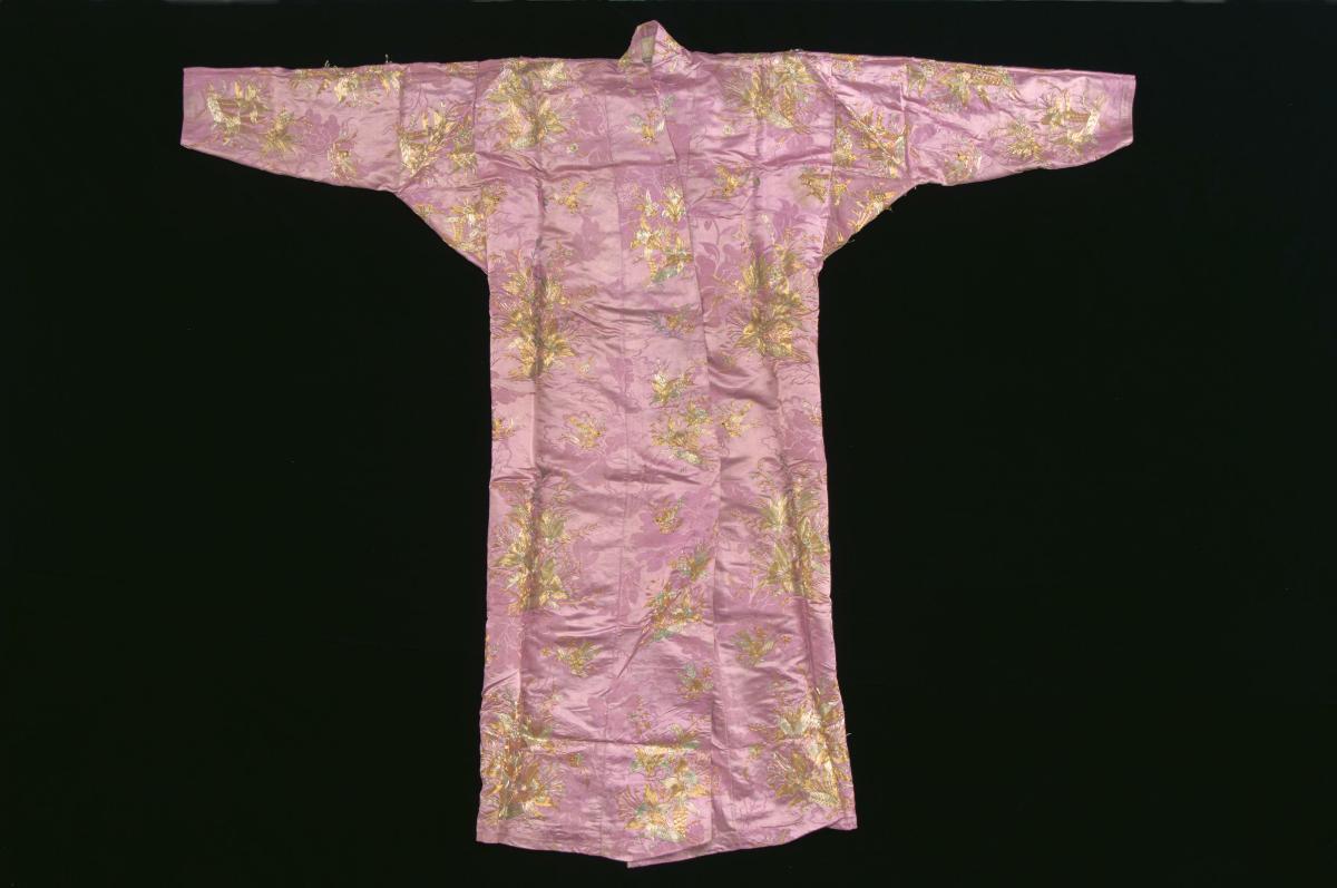 This pink baju panjang is embellished with large peony motifs. Baju panjangs are hip or knee length long tunics with v-shaped openings. Silk baju panjangs were worn by Peranakan brides on the twelfth day of the traditional Peranakan wedding ceremony. In the late nineteenth century, Peranakan women wore batik baju panjang in subdued shades. In the 1920s, chemical dyes introduced a range of colours, producing colourful baju panjangs. The baju panjang remained fashionable for young girls in Penang and Malacca up until the first decade of the twentieth century, when the far more form-fitting kebaya overtook it in popularity.