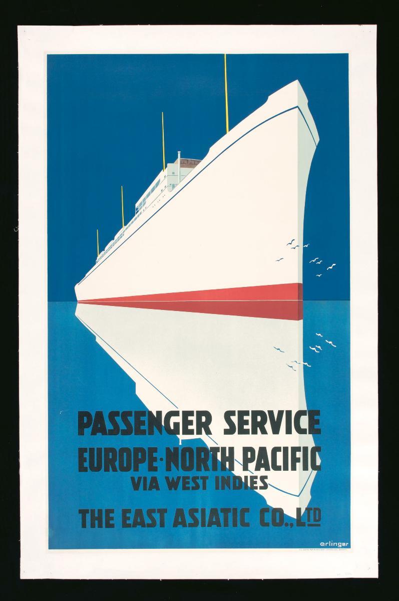 Established in 1897, the Danish East Asiatic Company initially serviced Europe and a number of Asian countries, offering passenger service as well as trade in rice, timber, oilseed and spices. In this poster of a nighttime image with illuminated ports-of-call on a darkened map in the background, a passenger service ship, possibly the Selandia, is shown in the distance with a small junk and two Asian sailors onboard.The image for this poster was also used on other promotional material like brochures. The passenger service advertised at this time was carried by the vessels Falstria, Selandia, Jutlandia, Lalandia, Meonia and served a number of ports of call in Asia, namely Penang, Port Swettenham, Singapore and Bangkok.