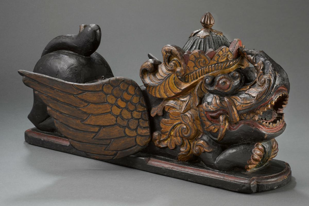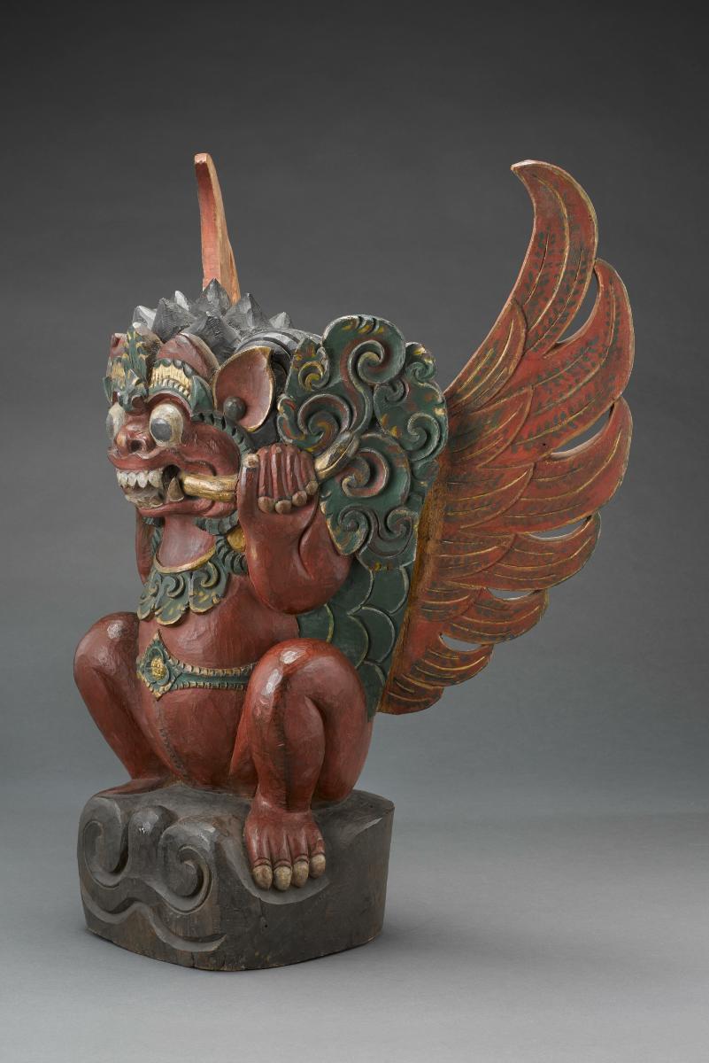 Carved wooden figure of a winged lion, known as a singa barong seated on a plinth of stylized clouds. Such figures were a common subject of Balinese traditional carvings and were often used as decorative finials crowning roof beams in temples or palaces. Singa barong are protective creatures dedicated to helping humans and keeping demonic forces at bay so they are often found as architectural features – especially placed to guard entrances and passages. In Balinese mythology a singa barong is sent to the earth to defeat a rampant witch named Rangda who eats children and caused chaos among the people.