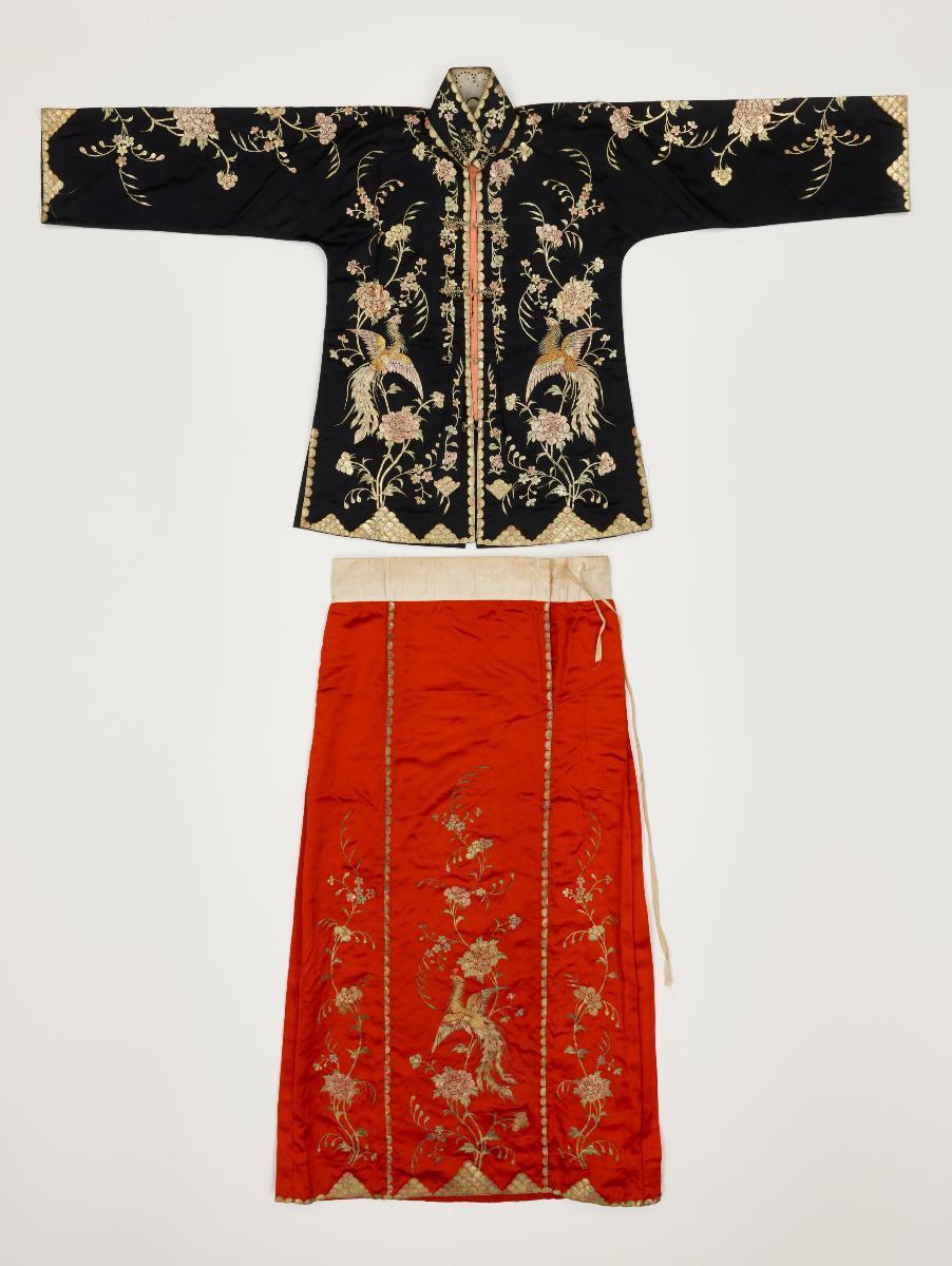 This kua, or Chinese bridal outfit, comprises of a fitted black jacket and red skirt, a colour combination popular in the 1940s and 1950s. It is embroidered with metallic thread that form motifs of dragons and phoenixes, and contains a Hong Kong shop tag. The kua came into fashion in the 1940s, when Chinese brides moved away from looser bridal styles to more tailored looks. After the bride wore it on her wedding day, it was subsequently used during special occasions such as Lunar New Year. Shanghainese tailors were highly lauded for their skills in creating such garments, many who fled to Hong Kong in the 1940s due to the civil war in China.