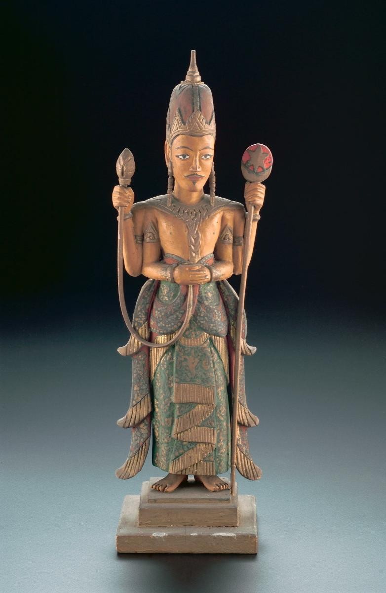 This miniature chair is gilded and decorated with motifs of Chinese dragons and clouds. The chair is placed on the altar and statues of deities worshipped by Peranakans would be placed on it.