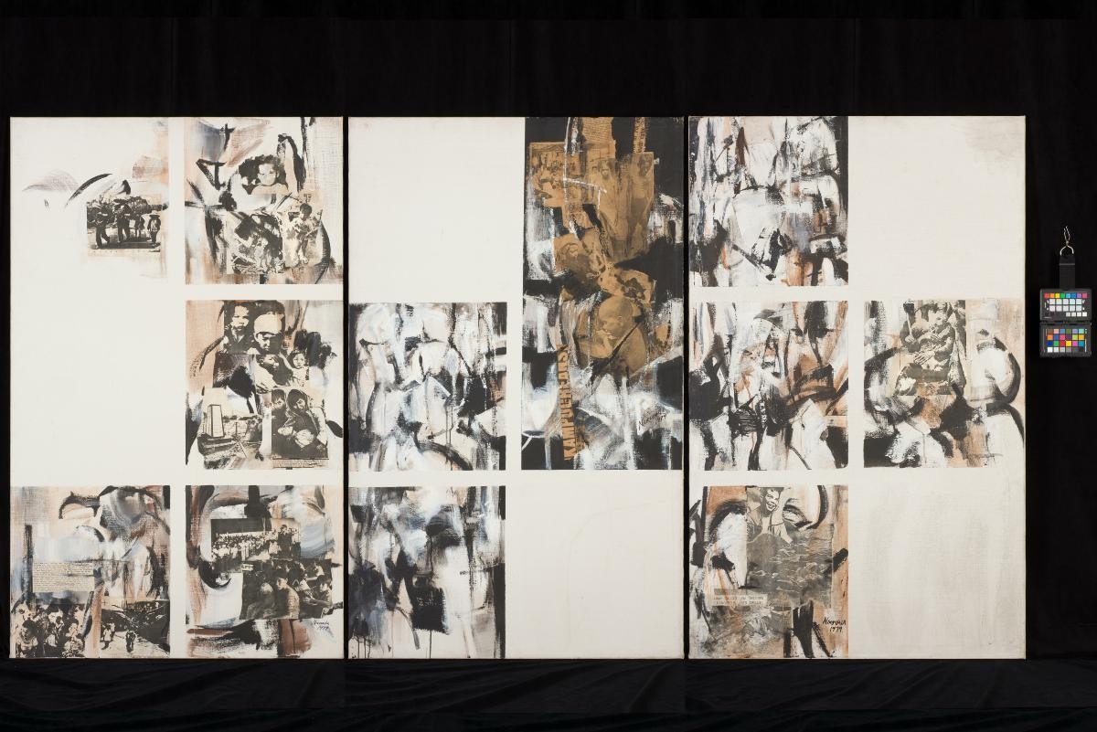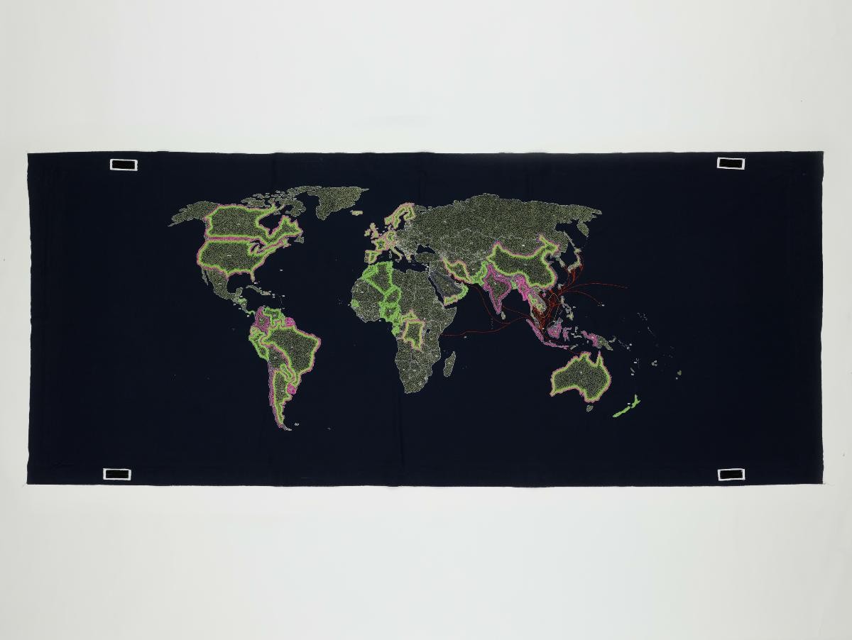 ‘remapping the Vietnam Exodus: refugee numbers and camp locations in Asia’ by Tiffany Chung, does as its title suggests – it attempts to re-present cartographically, the raw, hard statistical numbers of fleeing Vietnamese who left their homeland between 1979 and 1989 as political refugees after the Vietnam war to other countries across Asia. The artwork itself is a hand-drawn map of Southeast and East Asia. Each country is delicately demarcated in faint but solid lines, within which are a population of vibrant points that mark with varying intensity the regions in which the Vietnamese refugees settled. Drawn with such lightness that the dots and lines appear to be floating off the paper, the details on the map start to resemble microbial cultures under a microscope, creating juxtaposition between growing organisms and the tens of thousands of Vietnamese refugees that landed on the coasts of numerous Asian countries.