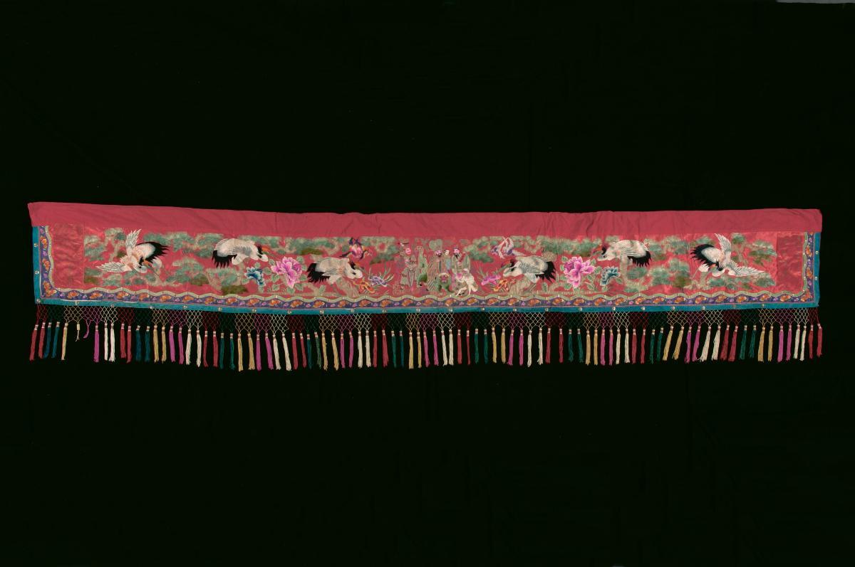 This striking satin damask panel is embroidered on both sides with a five-clawed dragon amid stylised clouds and other auspicious motifs. The dragon, a symbol of imperial authority, is magnificently embroidered in gold-wrapped threads while the other motifs are worked in coloured silk threads. The latter include bats carrying swastikas, which signify boundless happiness or manifold blessings, and the Eight Buddhist Emblems (endless knot, conch shell, lotus, double fish, standard of victory, vase, canopy, and wheel). The dragon appears fixated on a flaming pearl, which embodies wisdom and enlightenment. Based on the large size and orientation of the design, this textile was most likely used as a curtain or a decorative hanging in the palace or a temple that enjoyed imperial patronage.