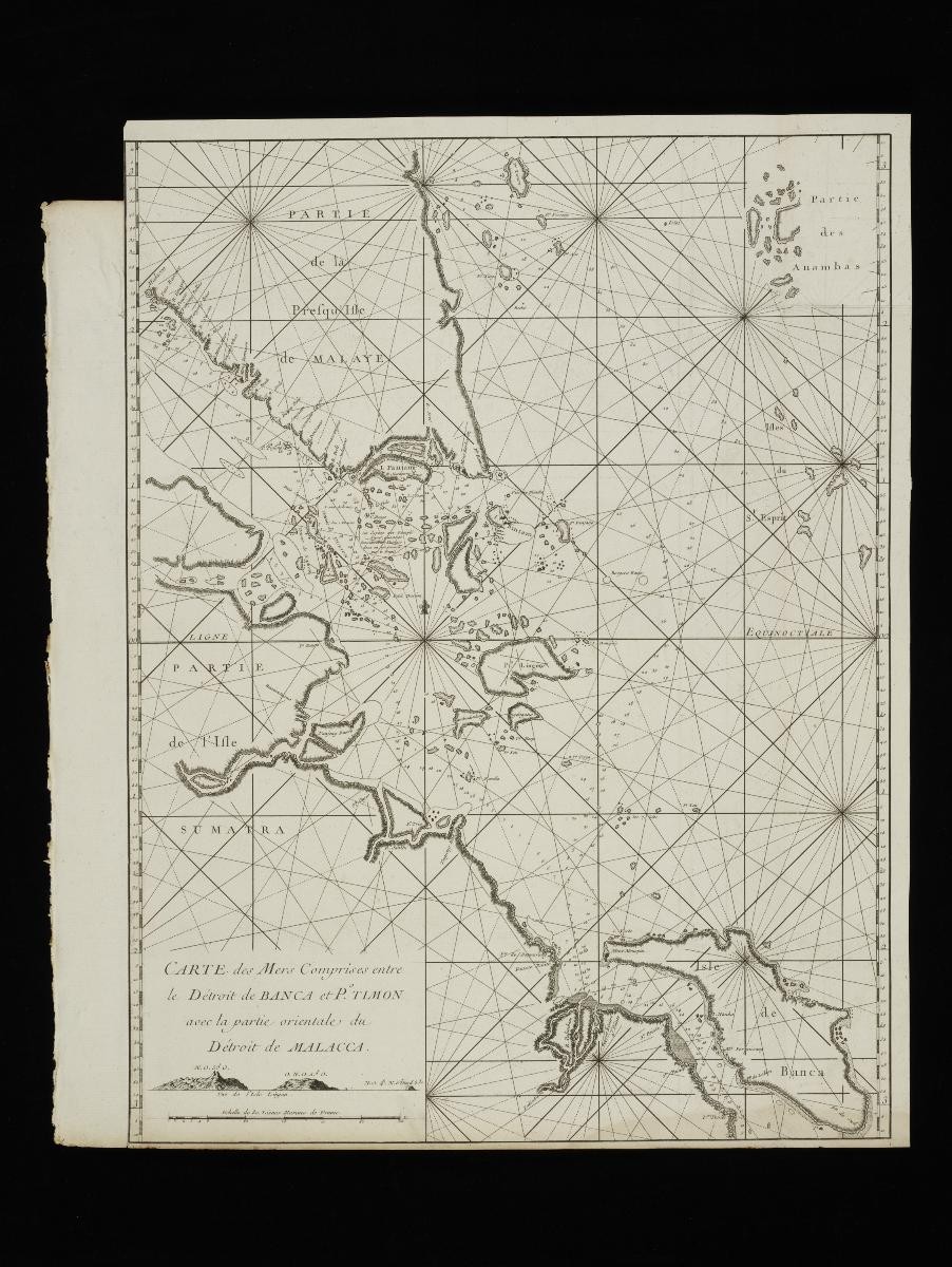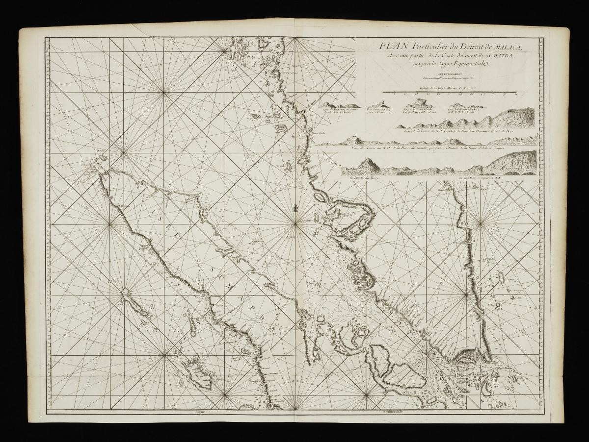 This 1775 chart of the Straits of Malacca was produced based on materials gathering during the travels of Jean Baptiste Nicolas Denis D’Après de Mannevillette, a captain for the French East India Company. It was part of an expanded atlas – Le Neptune Oriental – published by Mannevillette charting much of the known world at that time. Singapore is identified in this map as “I. de Jatana ou de Saincapour” – a reference to the island being named either Singapore or Ujong Tanah, or land’s end.