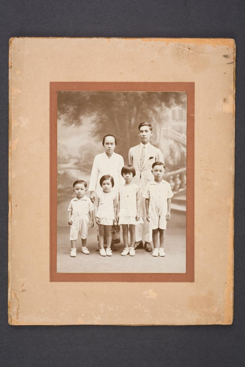This studio portrait of a group of four Chinese boys was taken at Bright Star Studio, located on 227 and 229, New Bridge Road. The boys are posed in front of a studio backdrop of painted scenery, with one of the boys seated on a toy car.