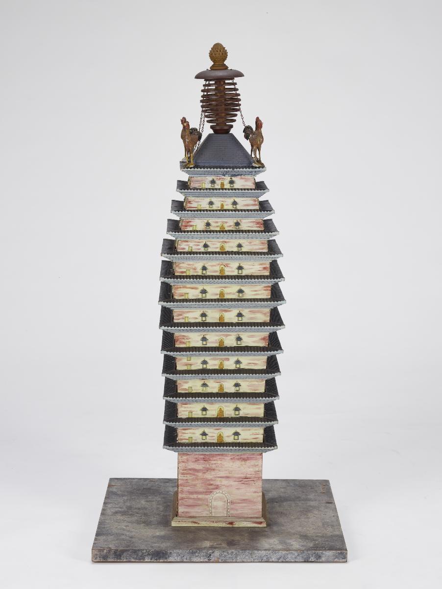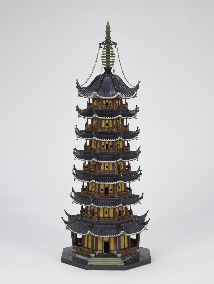 This is a model of the Pagoda of Misericordia Holiness (Cishengsi ta 慈圣寺塔), which was constructed during the Ming dynasty in Wanping city (present day Beijing). The 13-storey octagonal structure is made of bricks and clay, standing at 83 metres tall. The model is one of a set of 84 carved after famous originals scattered throughout China, for the Chinese exhibition at the 1915 Panama-Pacific International Exposition (PPIE) in San Francisco, one of the first to represent the newly formed Republic of China. Scaled down at a ratio of 1:50, they were made by the Tushanwan 土山湾Workshop, a Christian orphanage in Shanghai that trained its residents in vocational art and crafts. The woodcarving workshop, supervised by the Bavarian-born Jesuit Aloysius Beck (1854-1931), employed both local and Western styles and techniques to produce figures of traditional Chinese gods alongside those of Catholic saints.The model is one of a set of 84 carved after famous originals scattered throughout China, for the Chinese exhibition at the 1915 Panama-Pacific International Exposition (PPIE) in San Francisco, one of the first to represent the newly formed Republic of China. Scaled down at a ratio of 1:50, they were made by the Tushanwan 土山湾 Workshop, a Christian orphanage in Shanghai that trained its residents in vocational art and crafts. The woodcarving workshop, supervised by the Bavarian-born Jesuit Aloysius Beck (1854-1931), employed both local and Western styles and techniques to produce figures of traditional Chinese gods alongside those of Catholic saints.