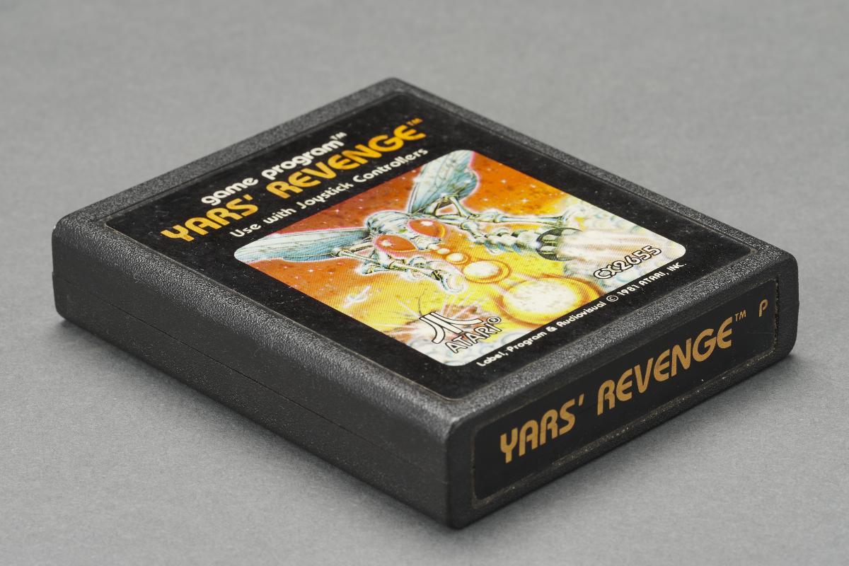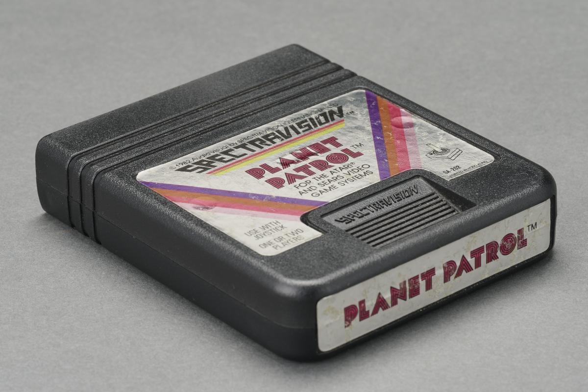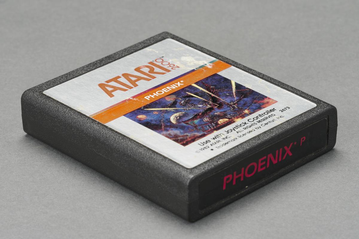 This is a Space Invaders game cartridge that was used with the Atari 2600 video game console. Space Invaders was one of the most popular video games in the late 1970s to 1980s. It is a shooter game where the player shoots waves of aliens to prevent them from landing on earth. The game was launched in 1978, before being licensed by Atari in 1980. The game was a bestseller and contributed to the take-up of Atari consoles. In the early 1980s, video games were a popular form of entertainment for children and youth in Singapore. They played games at video game centres, or at home on computers or video game consoles such as the Atari 2600. Shooter games and space-themed games were popular during the 1980s, in line with the broader interest in space in popular culture.