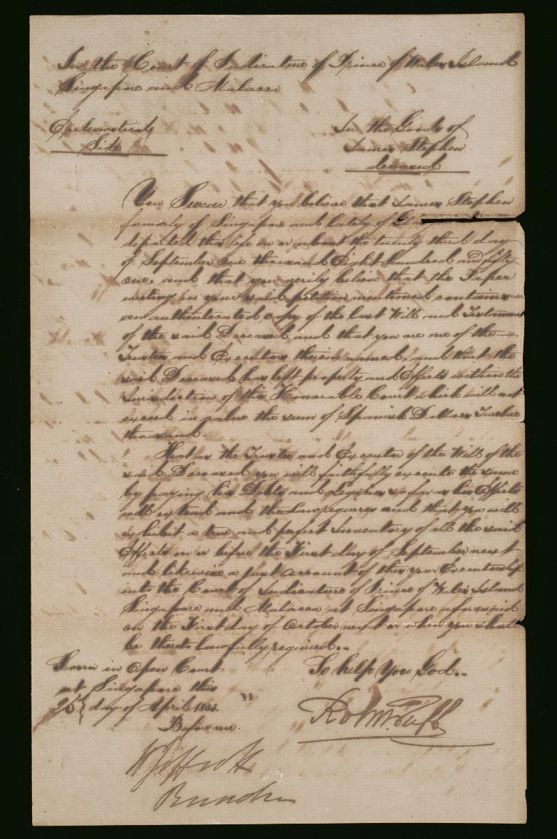 This is an oath administered to Richard Joseph Knight on 12 January 1864 in relation to the administration of the estate of George Mansfield. It is part of a collection of legal documents from the 19th and early 20th centuries which provides a glimpse into the work of the notable personalities who left their mark on Singapore’s legal history, and the economic and other transactions undertaken by ordinary immigrants in 19th century Singapore that tell stories of misfortune and indebtedness which would otherwise have disappeared from history.
