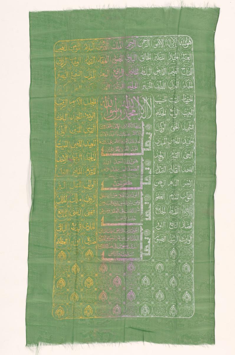 This green textile with yellow tinsel trim was bought by the donor in Pakistan.