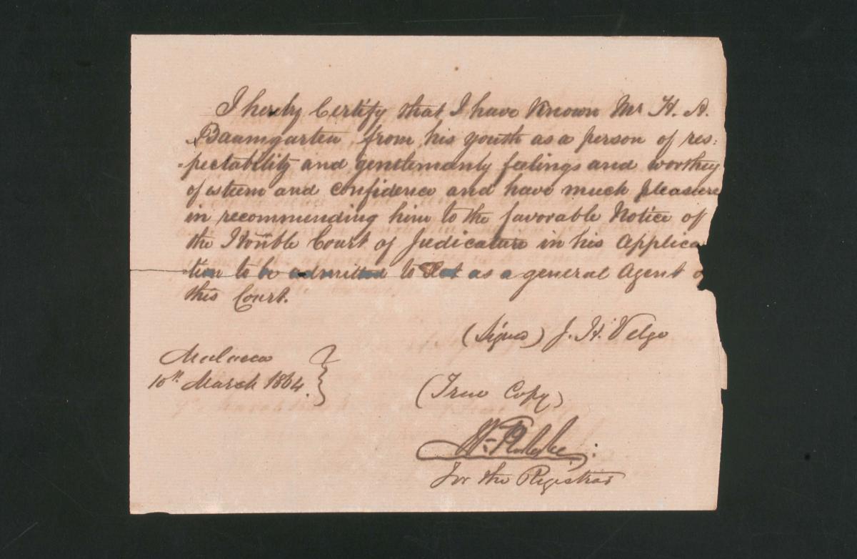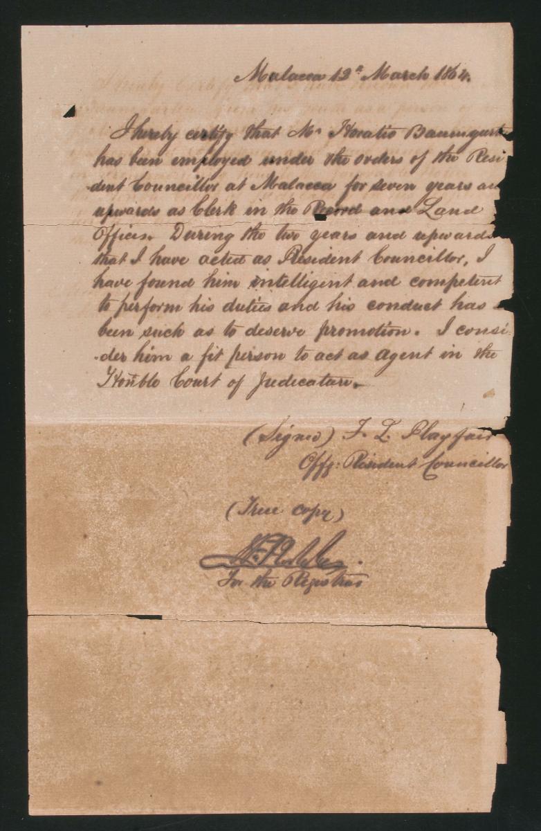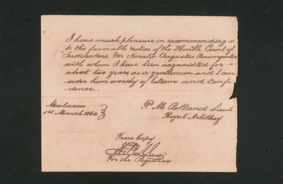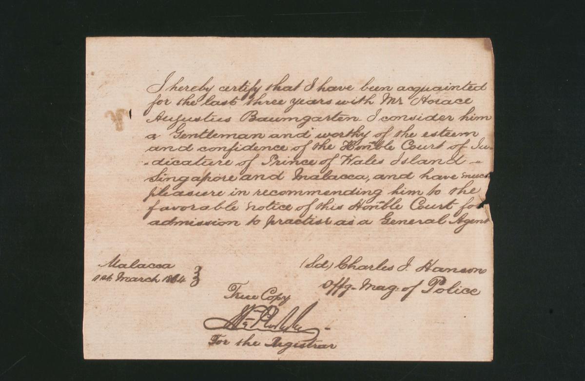 This is a testimonial for Horace Augustus Baumgarten issued on 9 March 1864. It is part of a collection of legal documents from the 19th and early 20th centuries which provides a glimpse into the work of the notable personalities who left their mark on Singapore’s legal history, and the economic and other transactions undertaken by ordinary immigrants in 19th century Singapore that tell stories of misfortune and indebtedness which would otherwise have disappeared from history.