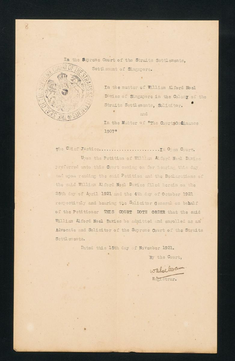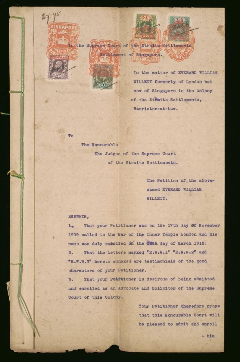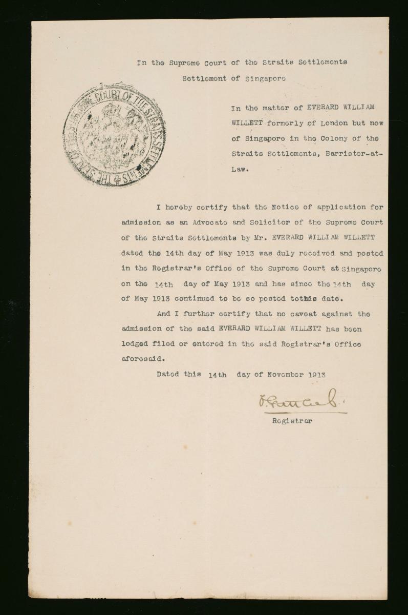 This is an order issued by the Supreme Court of the Straits Settlements on 14 July 1913 concerning the petition of Everard William Willett. It is part of a collection of legal documents from the 19th and early 20th centuries which provides a glimpse into the work of the notable personalities who left their mark on Singapore’s legal history, and the economic and other transactions undertaken by ordinary immigrants in 19th century Singapore that tell stories of misfortune and indebtedness which would otherwise have disappeared from history.