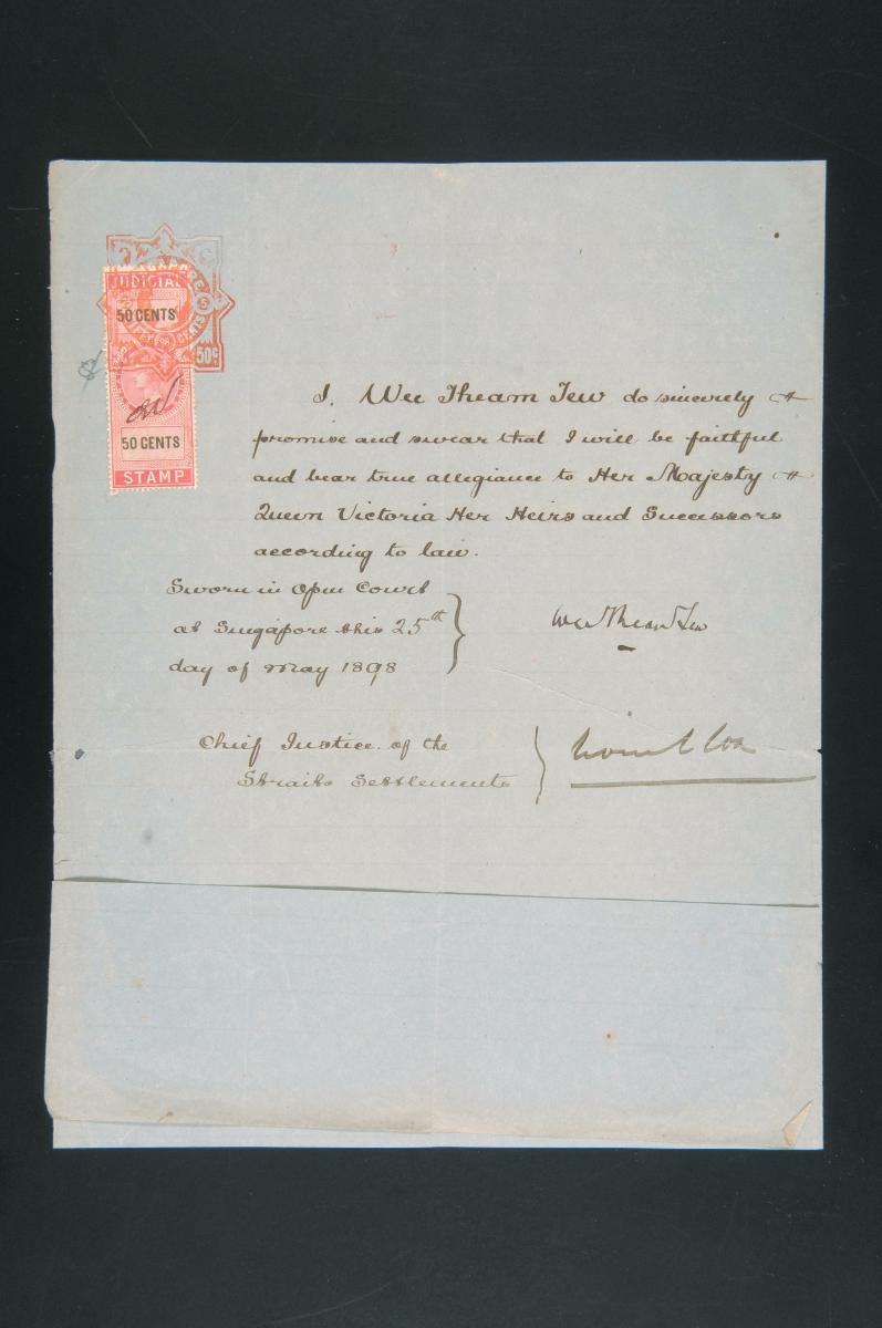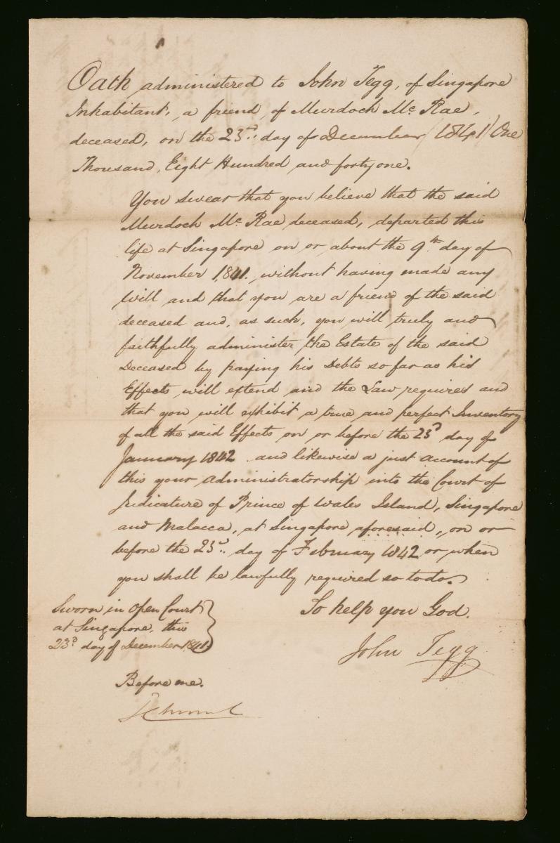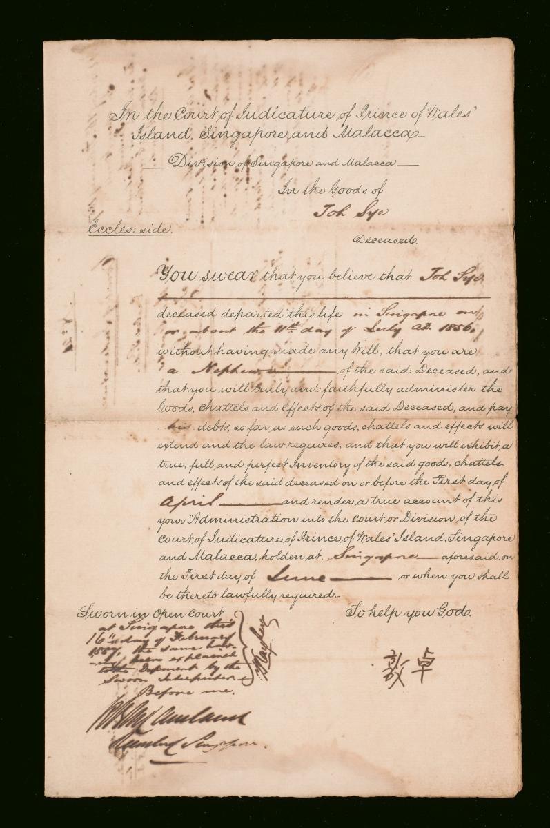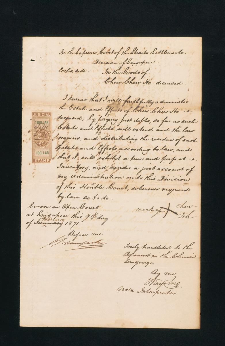 This is an oath sworn by Loh Tek Him on 21 February 1867 concerning the administration of the estate of the deceased Tay Seong Neo. It is part of a collection of legal documents from the 19th and early 20th centuries which provides a glimpse into the work of the notable personalities who left their mark on Singapore’s legal history, and the economic and other transactions undertaken by ordinary immigrants in 19th century Singapore that tell stories of misfortune and indebtedness which would otherwise have disappeared from history.