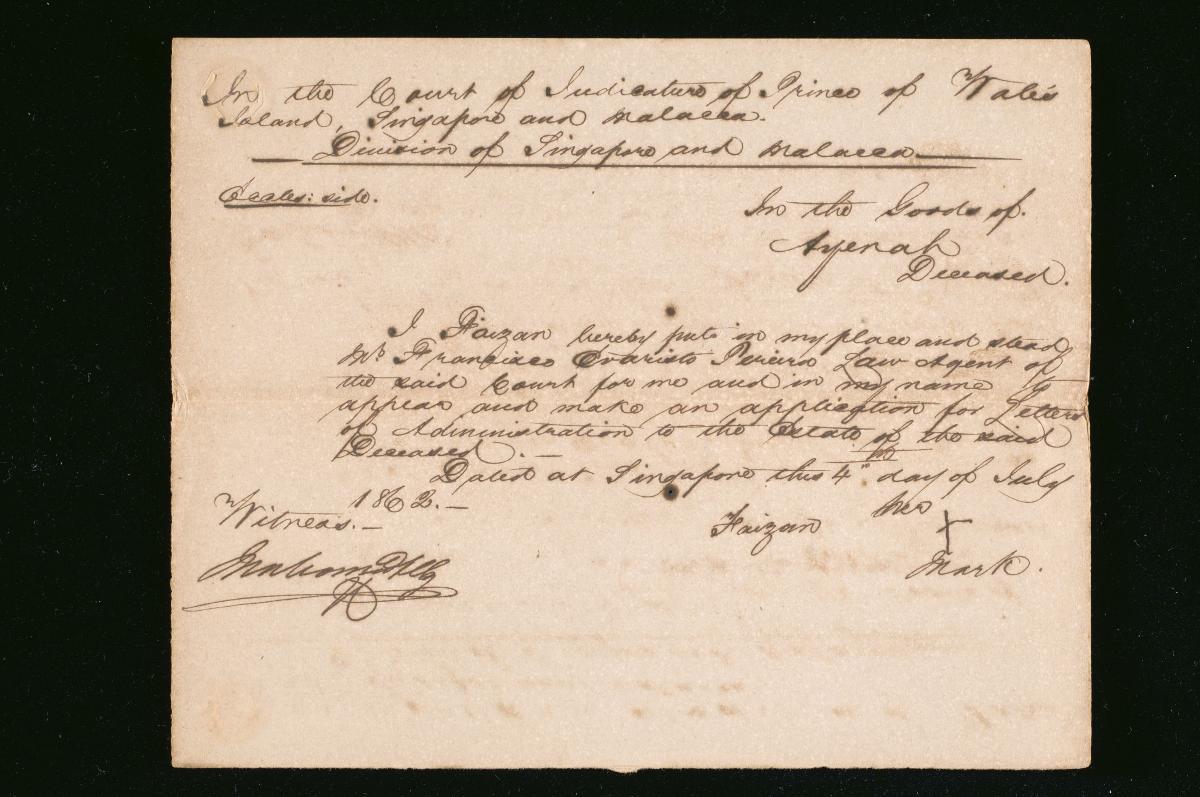 This is a warrant to act issued by Robert Stewart and Samuel Erskine on 1 November 1872 concerning the administration of the estate of the deceased Peter Manson. It is part of a collection of legal documents from the 19th and early 20th centuries which provides a glimpse into the work of the notable personalities who left their mark on Singapore’s legal history, and the economic and other transactions undertaken by ordinary immigrants in 19th century Singapore that tell stories of misfortune and indebtedness which would otherwise have disappeared from history.