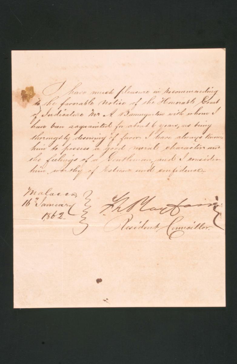 This is a testimonial dated 25 July 1863 for Alexander Augustus Baumgarten, concerning his application for admission as a general agent to the Court of Judicature of Prince of Wales' Island, Singapore and Malacca. It is part of a collection of legal documents from the 19th and early 20th centuries which provides a glimpse into the work of the notable personalities who left their mark on Singapore’s legal history, and the economic and other transactions undertaken by ordinary immigrants in 19th century Singapore that tell stories of misfortune and indebtedness which would otherwise have disappeared from history.