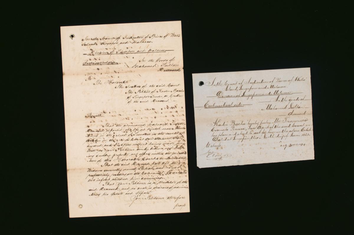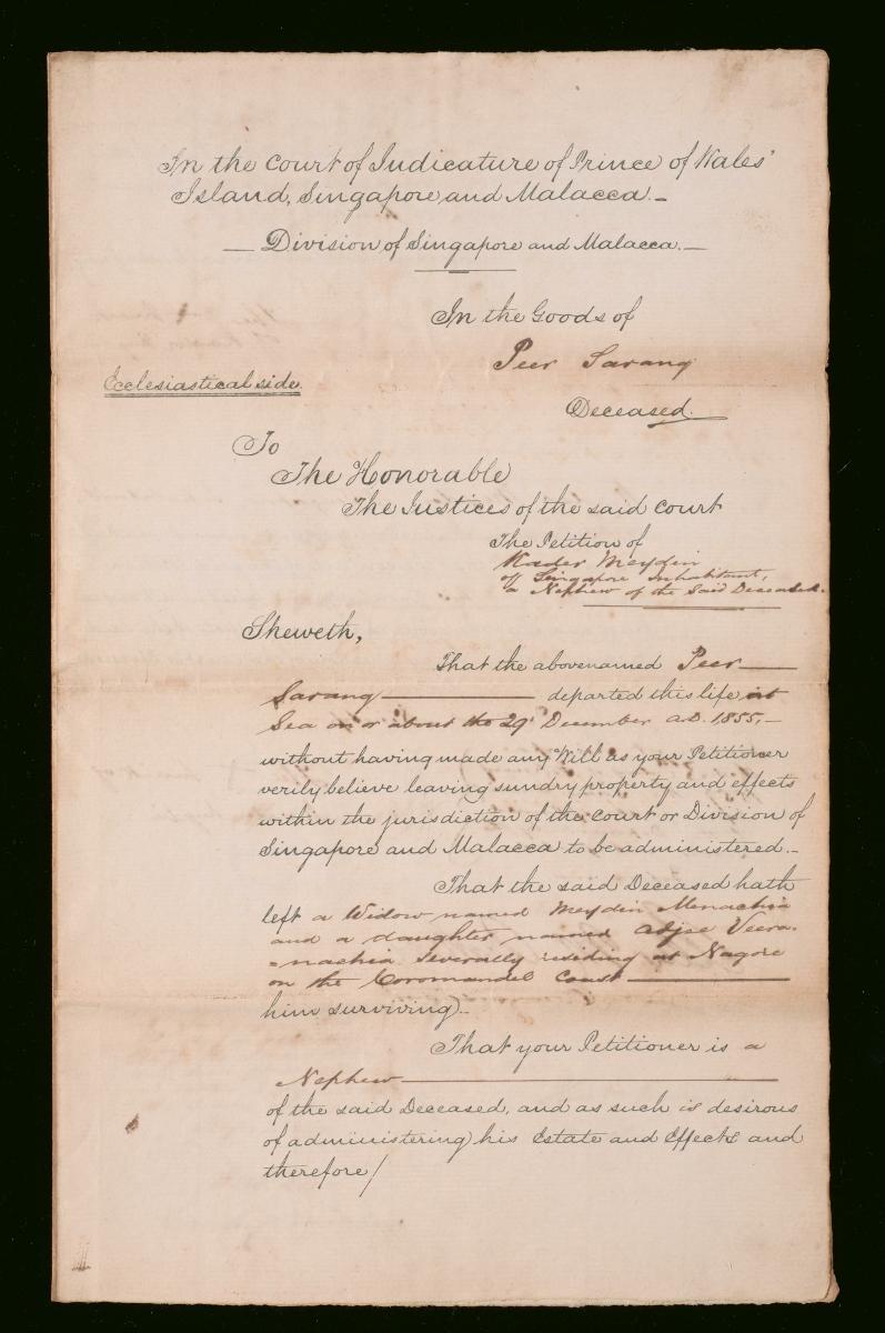 This is the petition and oath of Kader Saw made on 21 December 1837 concerning the administration of the estate of the deceased Napa Saile. It is part of a collection of legal documents from the 19th and early 20th centuries which provides a glimpse into the work of the notable personalities who left their mark on Singapore’s legal history, and the economic and other transactions undertaken by ordinary immigrants in 19th century Singapore that tell stories of misfortune and indebtedness which would otherwise have disappeared from history.