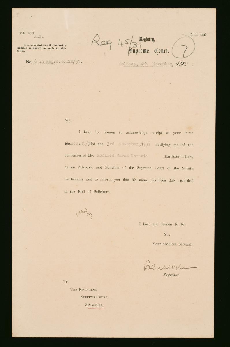 This is a letter dated 29 April 1931 from the Registrar of the Supreme Court, Malacca to the Registrar of the Supreme Court, Singapore concerning the petition of William Horace Salt. It is part of a collection of legal documents from the 19th and early 20th centuries which provides a glimpse into the work of the notable personalities who left their mark on Singapore’s legal history, and the economic and other transactions undertaken by ordinary immigrants in 19th century Singapore that tell stories of misfortune and indebtedness which would otherwise have disappeared from history.