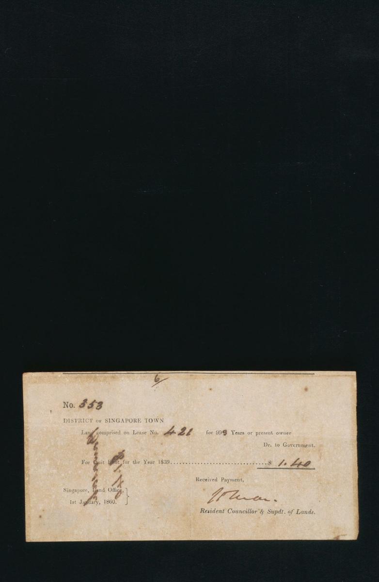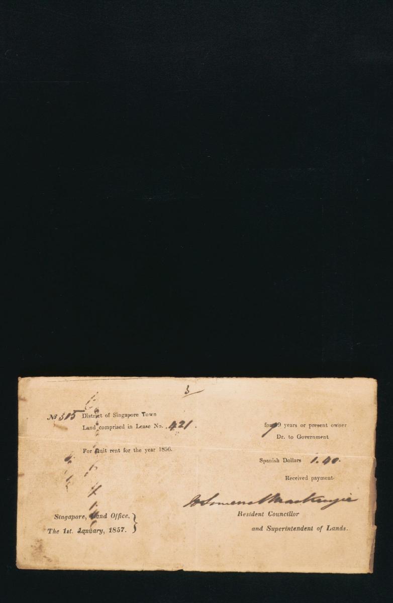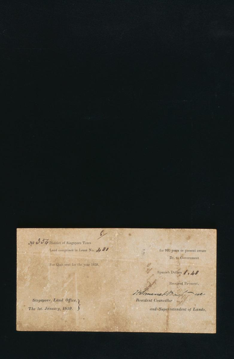 This is a receipt from the Singapore Land Office detailing the quit rent of 2 Spanish dollars for the year 1845 for "No. 284 District of Singapore Town: the land comprised in Grant No 417 for 99 years or present owner". It is part of a collection of legal documents from the 19th and early 20th centuries which provides a glimpse into the work of the notable personalities who left their mark on Singapore’s legal history, and the economic and other transactions undertaken by ordinary immigrants in 19th century Singapore that tell stories of misfortune and indebtedness which would otherwise have disappeared from history.