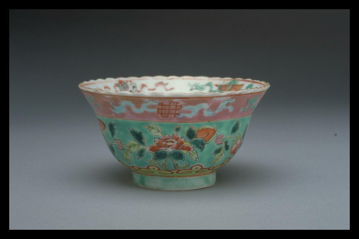 This ‘sancai’ (‘three-colour’) glazed wares comprise seven, small cups and a globular dish on a tray. They are decorated with splashes of grass green, dark brown and cream colour this set.It is 'mingqi' or burial ware that would have been part of a larger group of funerary items interred in the grave of a member of the ruling elite.The custom was an ancient one. It is thought these wares were necessary for the deceased in the next world. Elaborate groups of burial wares were also a display of wealth and social status.The practice of using lead-glazed burial wares had already started during the Han dynasty (206 BCE-220 CE). This glaze technology further developed during the Tang dynasty (618-906) into ‘sancai’ (‘three-colour’) glaze. It included colours such as cream, amber, brown and blue. The glaze tradition continued into the Ming period.
