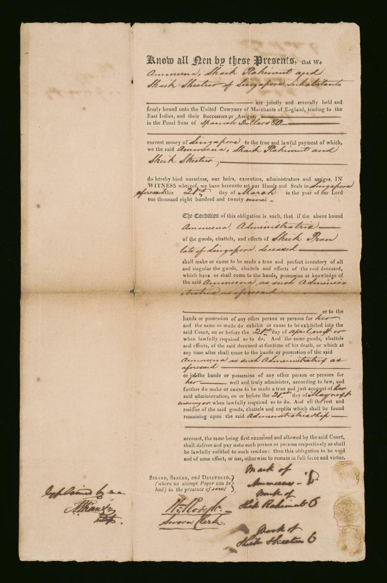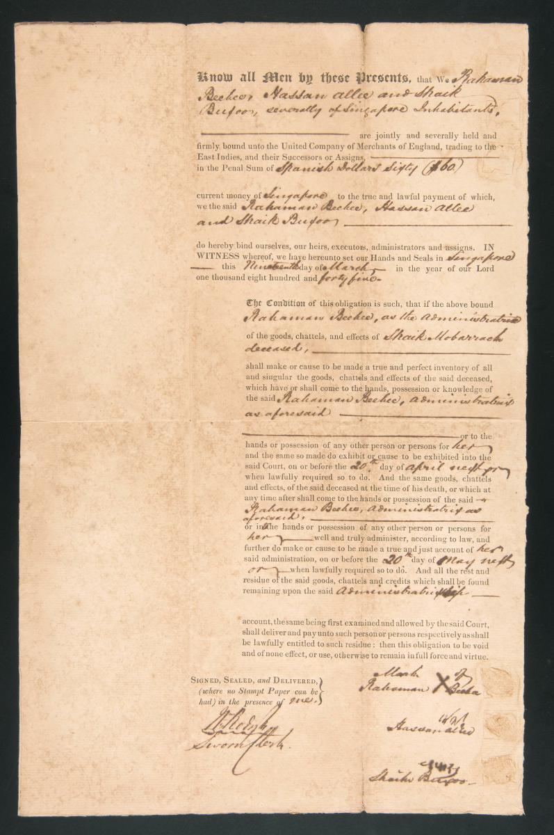 These are the letters of administration for the estate of Shaik Mobarrack, which were granted to his widow Rahaman Beebee by the Court of Judicature of Prince of Wales' Island, Singapore and Malacca on 20 March 1845. They are part of a collection of legal documents from the 19th and early 20th centuries which provides a glimpse into the work of the notable personalities who left their mark on Singapore’s legal history, and the economic and other transactions undertaken by ordinary immigrants in 19th century Singapore that tell stories of misfortune and indebtedness which would otherwise have disappeared from history.