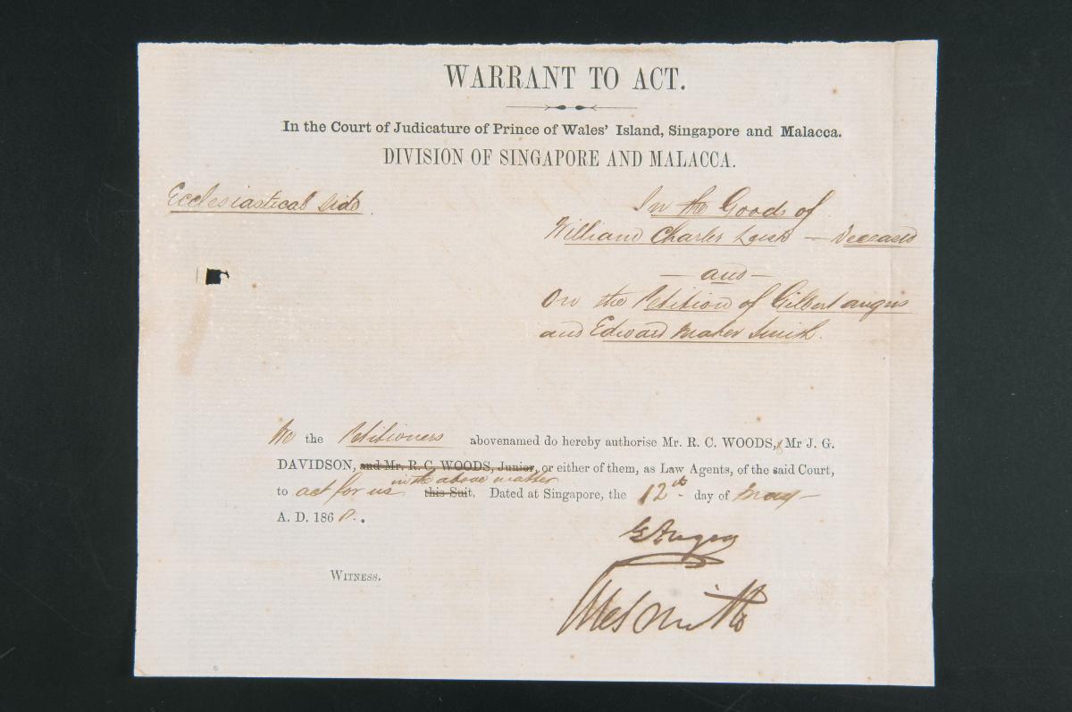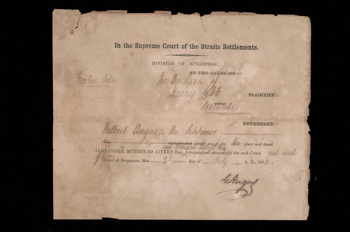 This is the cover page of the petition of Gilbert Augus filed on 5 July 1872. It is part of a collection of legal documents from the 19th and early 20th centuries which provides a glimpse into the work of the notable personalities who left their mark on Singapore’s legal history, and the economic and other transactions undertaken by ordinary immigrants in 19th century Singapore that tell stories of misfortune and indebtedness which would otherwise have disappeared from history.