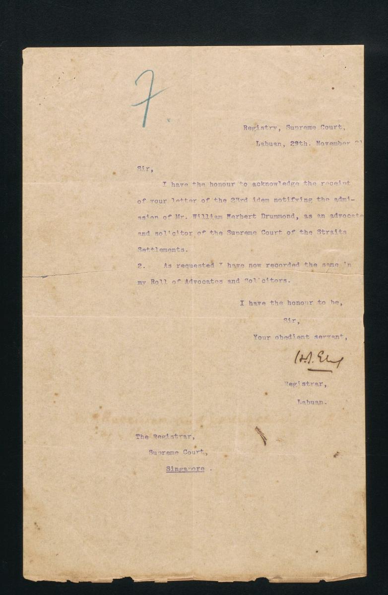 This is a notice filed on 12 November 1913 by the Registrar of the Supreme Court of the Straits Settlements, Settlement of Labuan, concerning the admission of Everard William Willett as a solicitor and advocate to the Supreme Court. It is part of a collection of legal documents from the 19th and early 20th centuries which provides a glimpse into the work of the notable personalities who left their mark on Singapore’s legal history, and the economic and other transactions undertaken by ordinary immigrants in 19th century Singapore that tell stories of misfortune and indebtedness which would otherwise have disappeared from history.