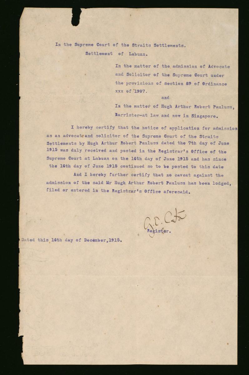 This is a certificate issued on 31 July 1861 by John Clancey, the clerk of the county of New York and the clerk of the First Judicial District of the Supreme Court of the State of New York, affirming that Edward Augustus Edgerton was admitted to practice as an attorney of the said Supreme Court. It is part of a collection of legal documents from the 19th and early 20th centuries which provides a glimpse into the work of the notable personalities who left their mark on Singapore’s legal history, and the economic and other transactions undertaken by ordinary immigrants in 19th century Singapore that tell stories of misfortune and indebtedness which would otherwise have disappeared from history.