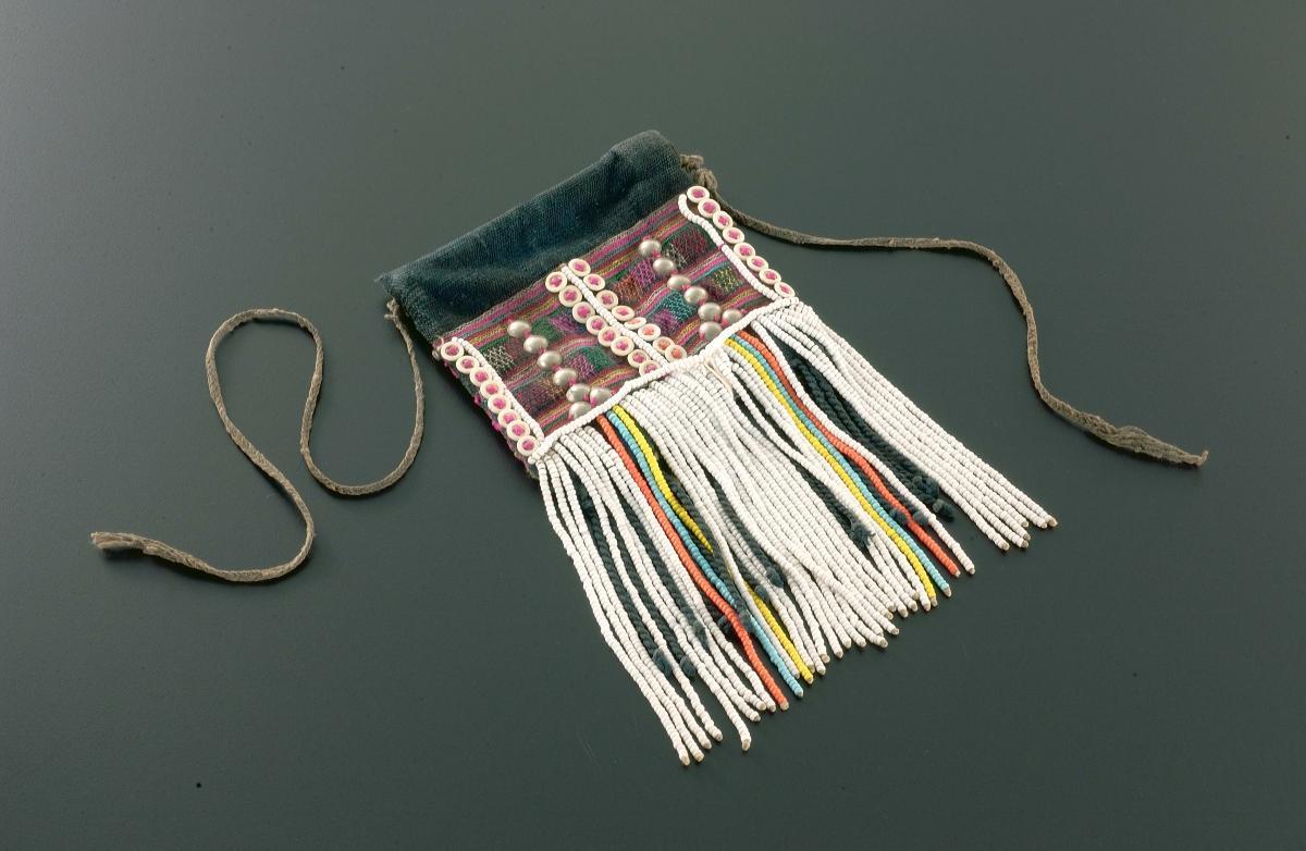 A Lisu women's outfit consists of a tunic, apron, pants or leggings and a sash with tassels such as this one. This pair of tassels has multicoloured strips of cloth sewn with colourful pompoms at the end. The strands in these tassels can vary from as many as 100 to 250 on each side.