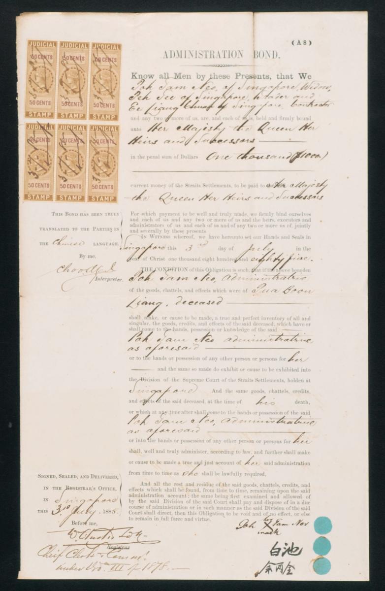 This is the administration bond of See Poon Neo, her husband Choa Kong, Wee Book Seng, and Choa Boon Teat made on 24 February 1864 concerning the administration of the estate of the deceased See Tan. It is part of a collection of legal documents from the 19th and early 20th centuries which provides a glimpse into the work of the notable personalities who left their mark on Singapore’s legal history, and the economic and other transactions undertaken by ordinary immigrants in 19th century Singapore that tell stories of misfortune and indebtedness which would otherwise have disappeared from history.