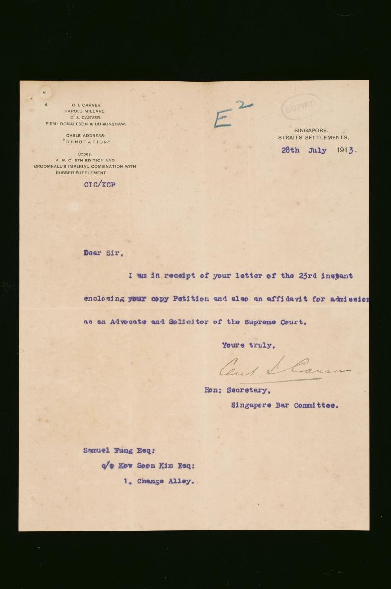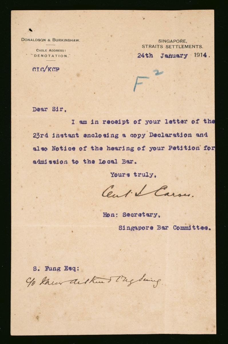 This is a letter dated 25 July 1914 from the Secretary of the Bar Committee of Penang to Samuel Fung. It is part of a collection of legal documents from the 19th and early 20th centuries which provides a glimpse into the work of the notable personalities who left their mark on Singapore’s legal history, and the economic and other transactions undertaken by ordinary immigrants in 19th century Singapore that tell stories of misfortune and indebtedness which would otherwise have disappeared from history.