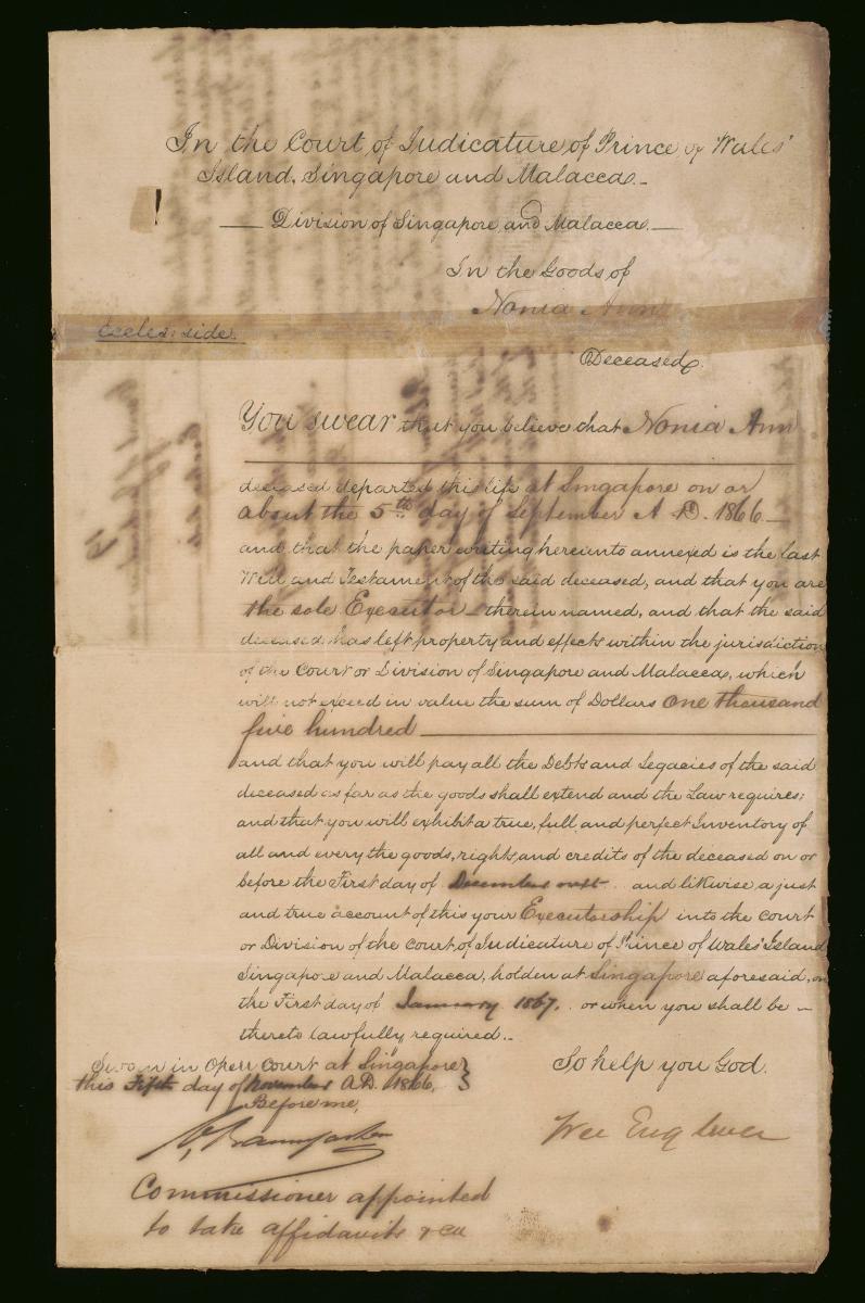 This is the oath of Wee Theam Tew sworn on 25 May 1898. It is part of a collection of legal documents from the 19th and early 20th centuries which provides a glimpse into the work of the notable personalities who left their mark on Singapore’s legal history, and the economic and other transactions undertaken by ordinary immigrants in 19th century Singapore that tell stories of misfortune and indebtedness which would otherwise have disappeared from history.