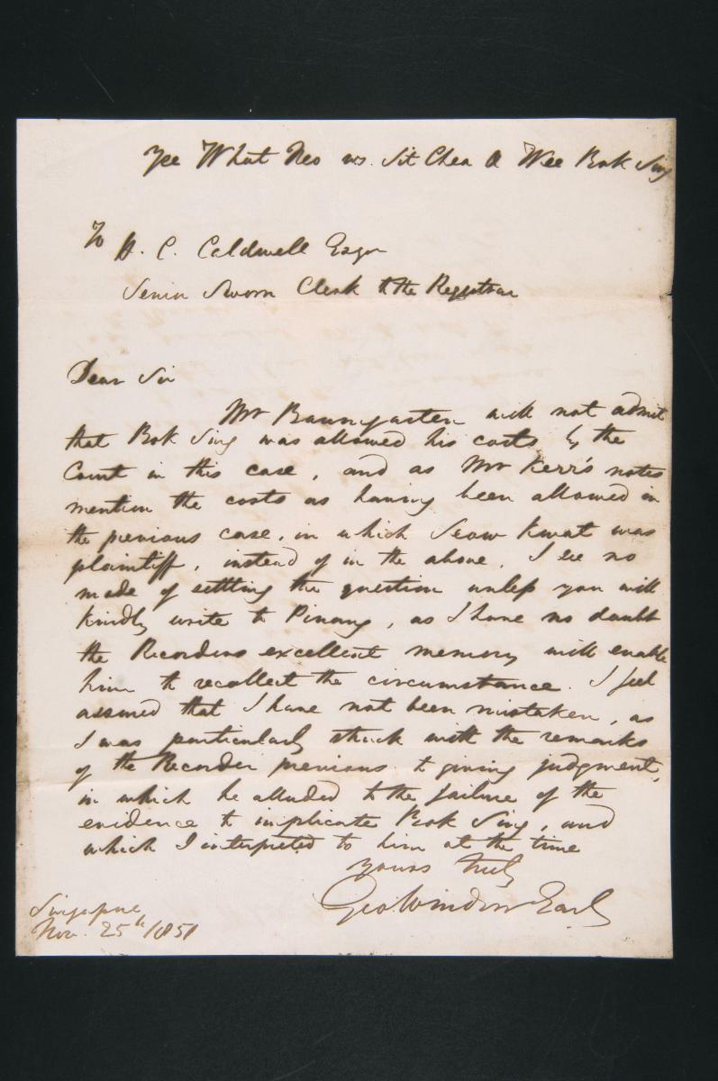 This is a receipt dated 19 November 1867 concerning the claim of Chee Sim Neo against Bautenberg Schmidt. It is part of a collection of legal documents from the 19th and early 20th centuries which provides a glimpse into the work of the notable personalities who left their mark on Singapore’s legal history, and the economic and other transactions undertaken by ordinary immigrants in 19th century Singapore that tell stories of misfortune and indebtedness which would otherwise have disappeared from history.