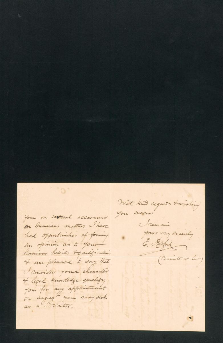 This is a testimonial for John Simons Atchinson dated 5 May 1859. It is part of a collection of legal documents from the 19th and early 20th centuries which provides a glimpse into the work of the notable personalities who left their mark on Singapore’s legal history, and the economic and other transactions undertaken by ordinary immigrants in 19th century Singapore that tell stories of misfortune and indebtedness which would otherwise have disappeared from history.