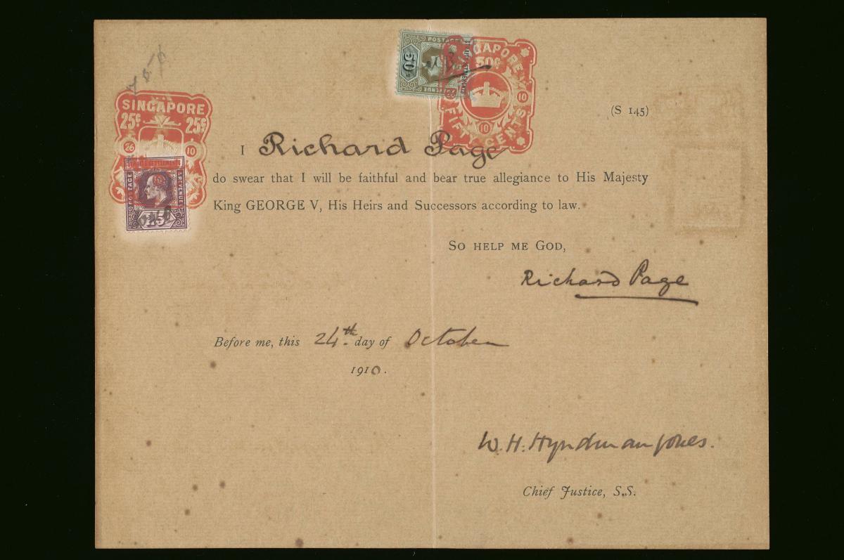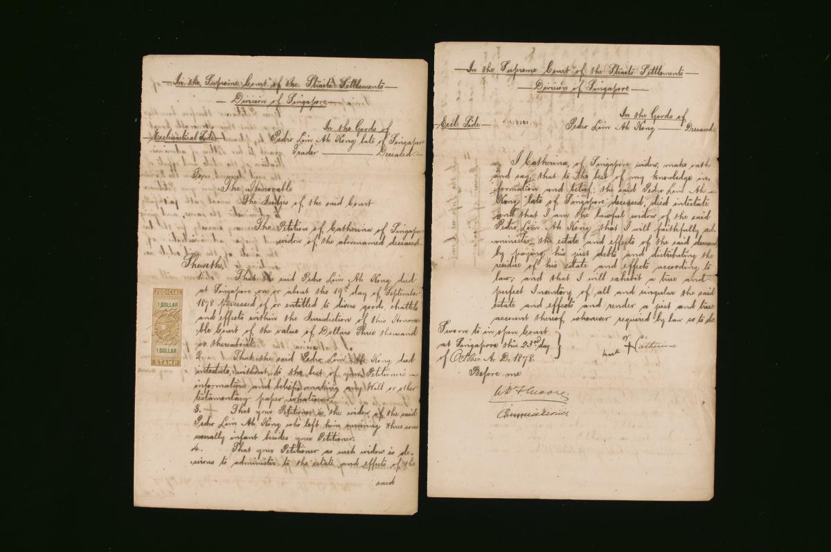 This is an oath administered to an unnamed individual on 18 June 1866 concerning the administration of the estate of the deceased Abraham. It is part of a collection of legal documents from the 19th and early 20th centuries which provides a glimpse into the work of the notable personalities who left their mark on Singapore’s legal history, and the economic and other transactions undertaken by ordinary immigrants in 19th century Singapore that tell stories of misfortune and indebtedness which would otherwise have disappeared from history.