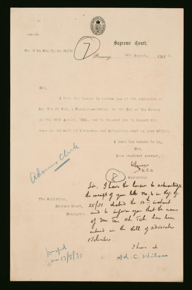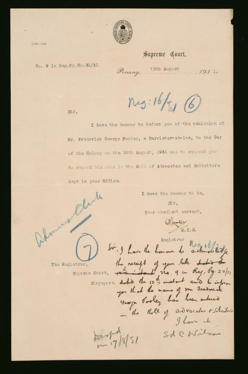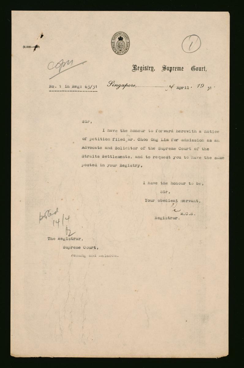 This is a request from N.A. Mallal to the Supreme Court, Singapore concerning the petition of Mohamed Javad Namazie. It is part of a collection of legal documents from the 19th and early 20th centuries which provides a glimpse into the work of the notable personalities who left their mark on Singapore’s legal history, and the economic and other transactions undertaken by ordinary immigrants in 19th century Singapore that tell stories of misfortune and indebtedness which would otherwise have disappeared from history.