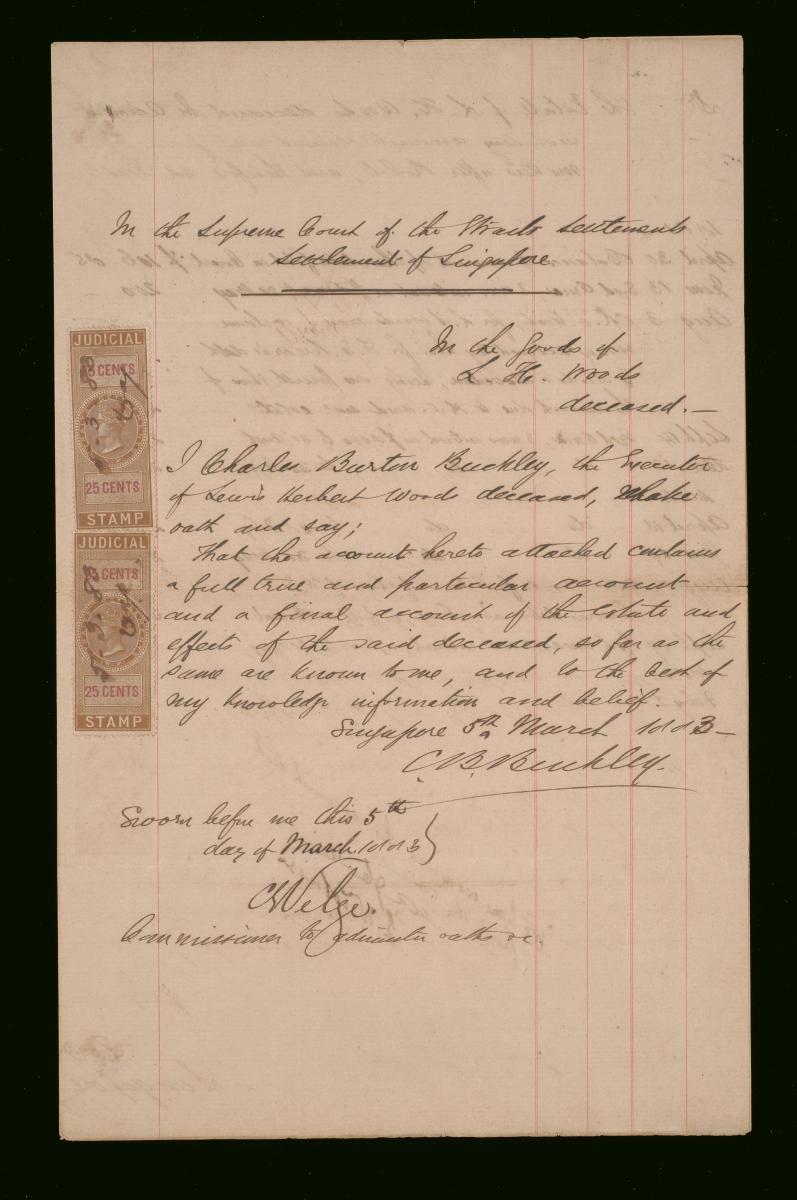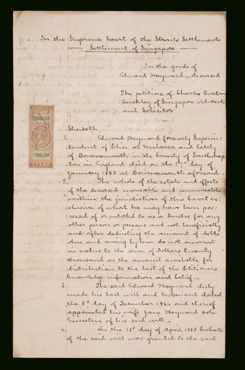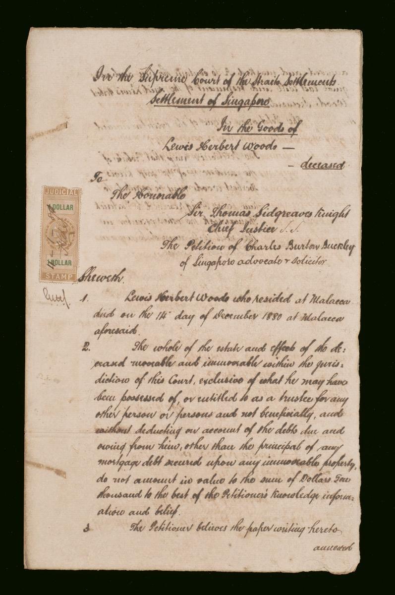 This is the cover page of the petition of Charles Burton Buckley for probate of the will of Lewis Herbert Woods filed on 4 January 1881. Probate was successfully granted on 20 January 1881. It is part of a collection of legal documents from the 19th and early 20th centuries which provides a glimpse into the work of the notable personalities who left their mark on Singapore’s legal history, and the economic and other transactions undertaken by ordinary immigrants in 19th century Singapore that tell stories of misfortune and indebtedness which would otherwise have disappeared from history.