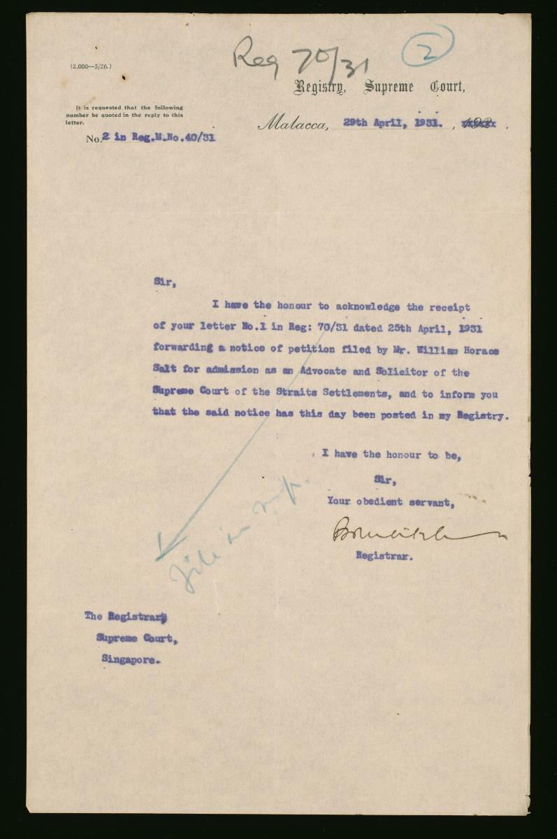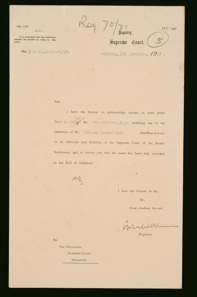 This is a letter dated 30 October 1931 from the Registrar of the Supreme Court, Malacca to the Registrar of the Supreme Court, Singapore, concerning the entry of Choo Ong Lim's name in the Roll of Solicitors. It is part of a collection of legal documents from the 19th and early 20th centuries which provides a glimpse into the work of the notable personalities who left their mark on Singapore’s legal history, and the economic and other transactions undertaken by ordinary immigrants in 19th century Singapore that tell stories of misfortune and indebtedness which would otherwise have disappeared from history.