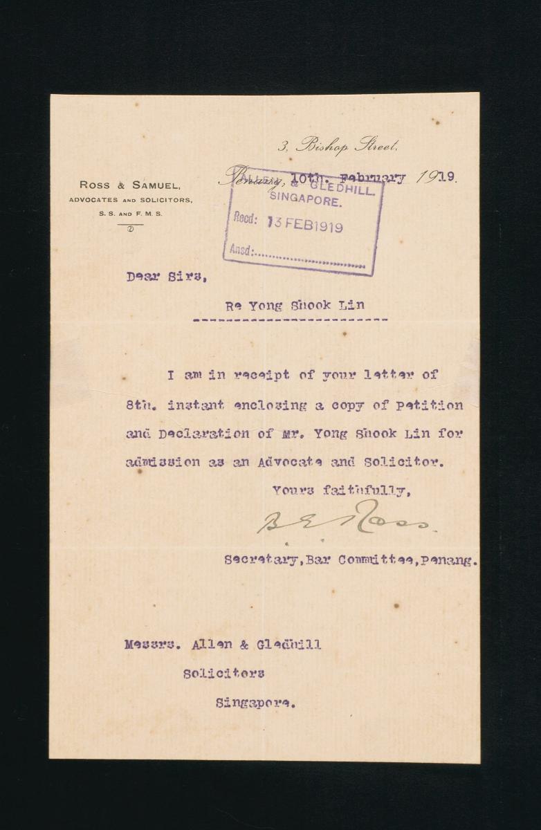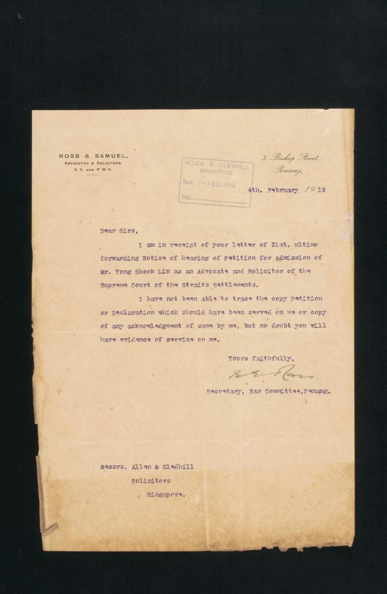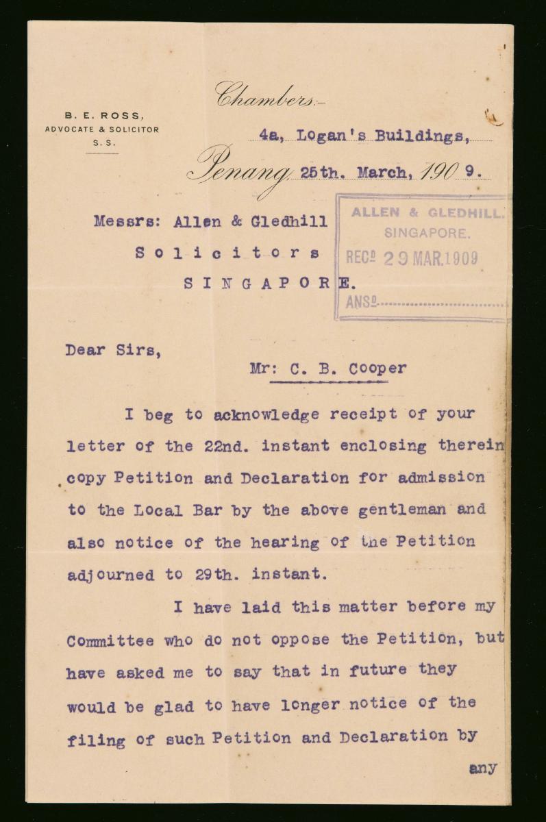 This is a letter of acknowledgement dated 13 November 1913 from the Hon Secretary of the Penang Bar Committee to Allen and Gledhill, concerning the admission of Everard William Willett as a solicitor and advocate to the Supreme Court of the Straits Settlements. It is part of a collection of legal documents from the 19th and early 20th centuries which provides a glimpse into the work of the notable personalities who left their mark on Singapore’s legal history, and the economic and other transactions undertaken by ordinary immigrants in 19th century Singapore that tell stories of misfortune and indebtedness which would otherwise have disappeared from history.