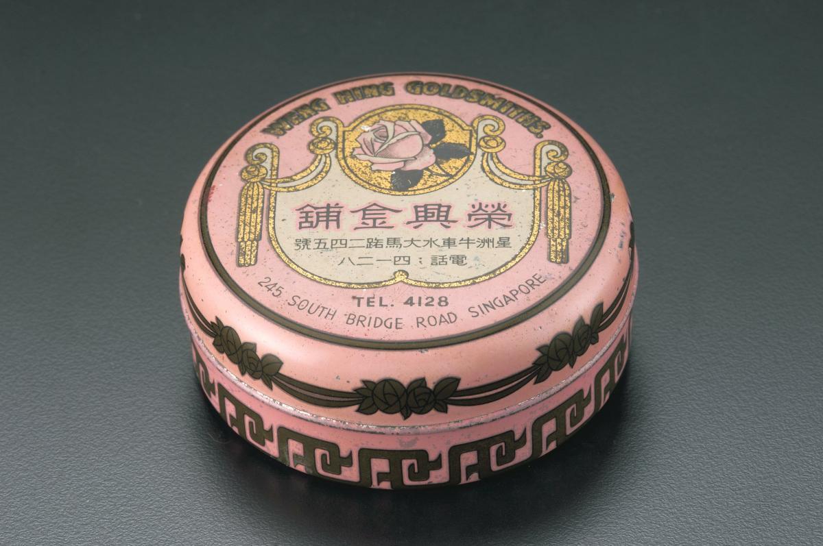 Gold is appreciated by the different ethnic communities in Singapore for its economic and symbolic values. Gold jewellery was often purchased as a form of investment, or to commemorate important milestones such as weddings and birthdays. Many of the local goldsmiths could be found along North and South Bridge Roads. The metal containers used to hold the gold pieces purchased by their customers also served as advertisements for their shops.