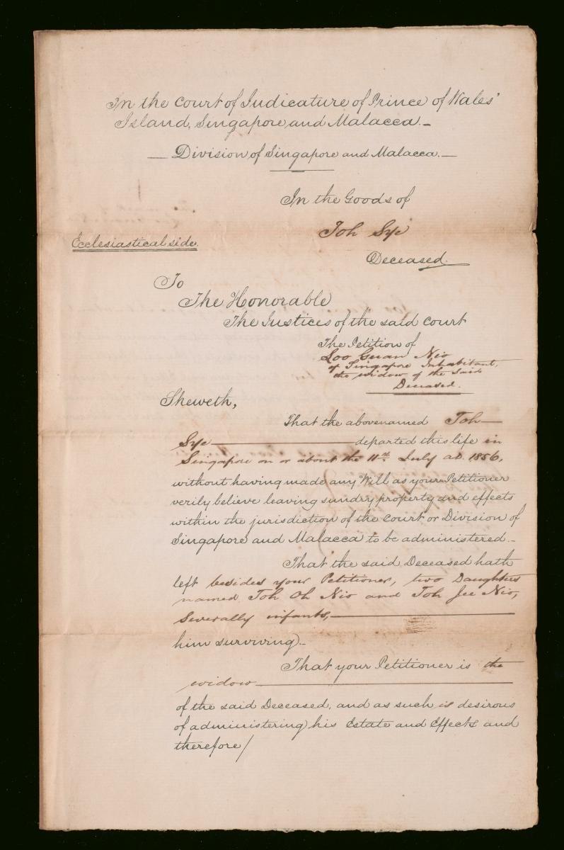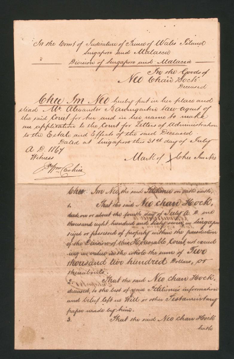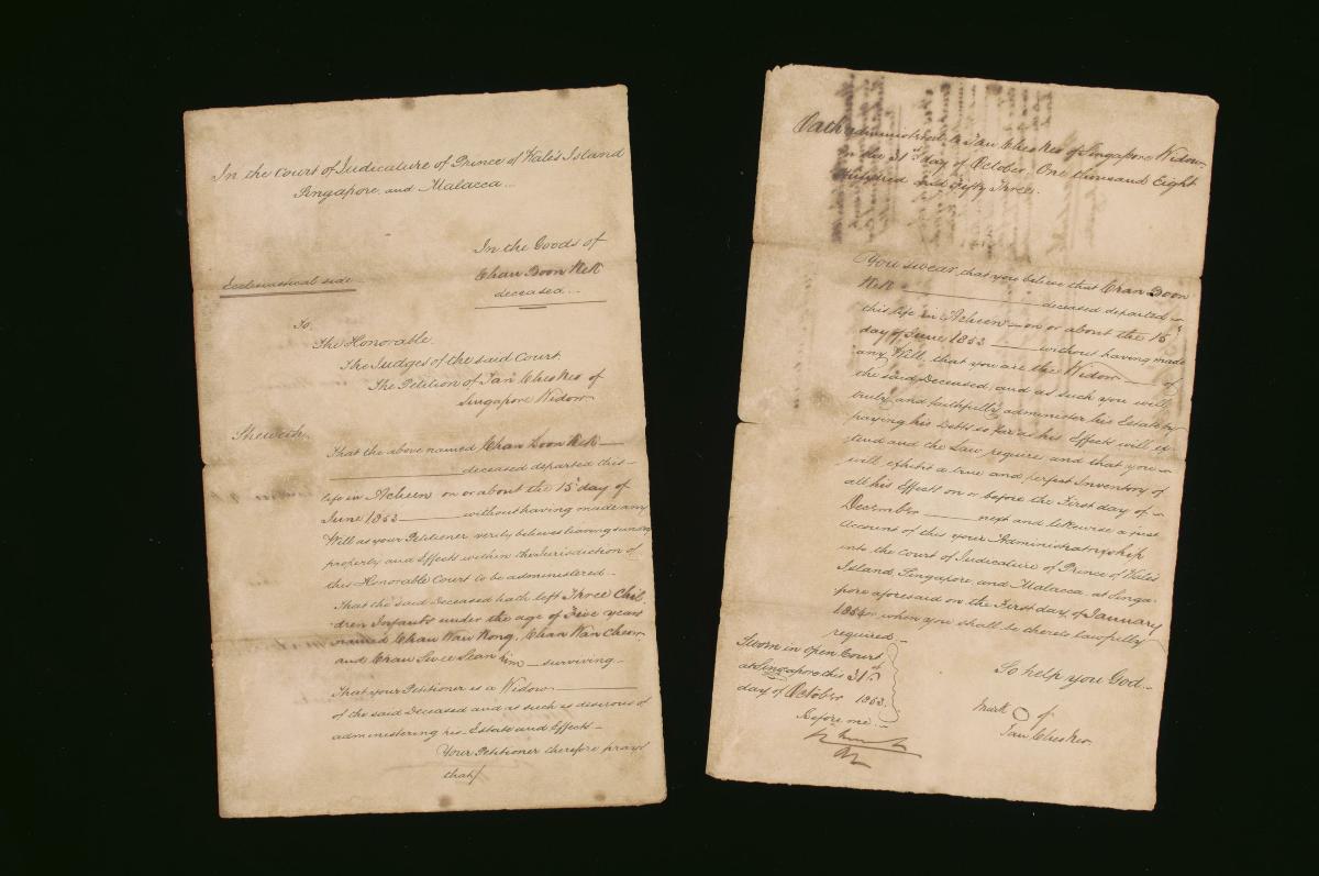 These are the petition and the oath of Chee Im Neo concerning the administration of the estate of Neo Chee Hock. They are part of a collection of legal documents from the 19th and early 20th centuries which provides a glimpse into the work of the notable personalities who left their mark on Singapore’s legal history, and the economic and other transactions undertaken by ordinary immigrants in 19th century Singapore that tell stories of misfortune and indebtedness which would otherwise have disappeared from history.