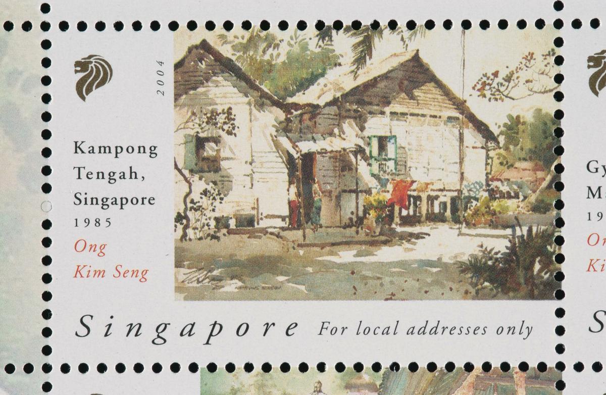 A stamp featuring 'Kampong Tengah, Singapore, 1985' by Ong Kim Seng