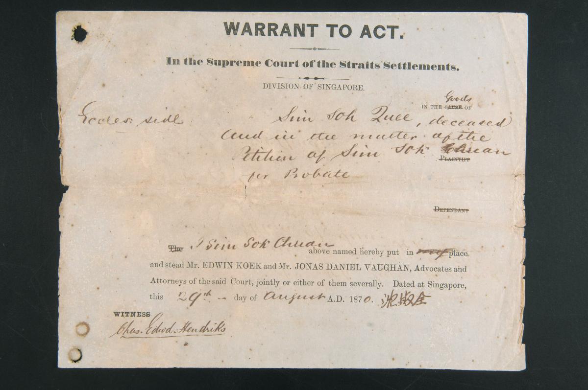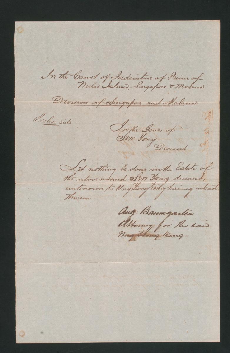 This is a document concerning Sim Soh Quee of Singapore. It is part of a collection of legal documents from the 19th and early 20th centuries which provides a glimpse into the work of the notable personalities who left their mark on Singapore’s legal history, and the economic and other transactions undertaken by ordinary immigrants in 19th century Singapore that tell stories of misfortune and indebtedness which would otherwise have disappeared from history.