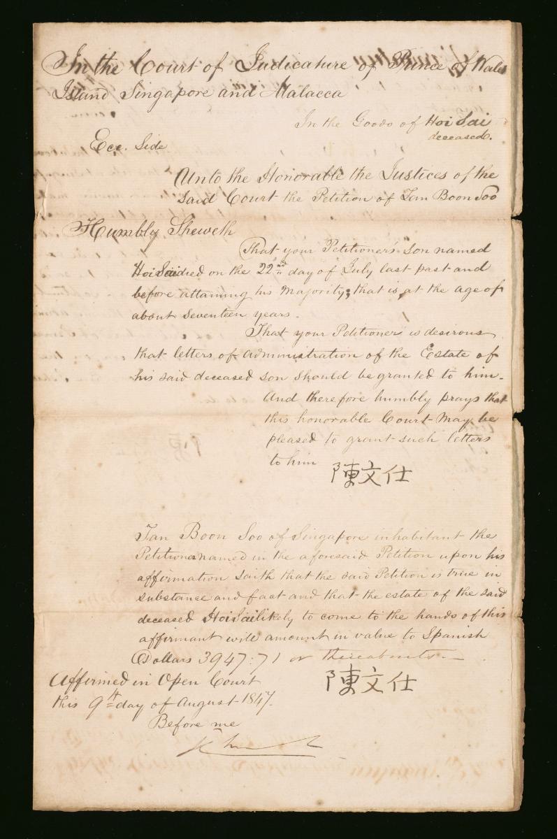 This is the petition of Tan Soo Git concerning the administration of the estate of Yeo Kwan. It is part of a collection of legal documents from the 19th and early 20th centuries which provides a glimpse into the work of the notable personalities who left their mark on Singapore’s legal history, and the economic and other transactions undertaken by ordinary immigrants in 19th century Singapore that tell stories of misfortune and indebtedness which would otherwise have disappeared from history.