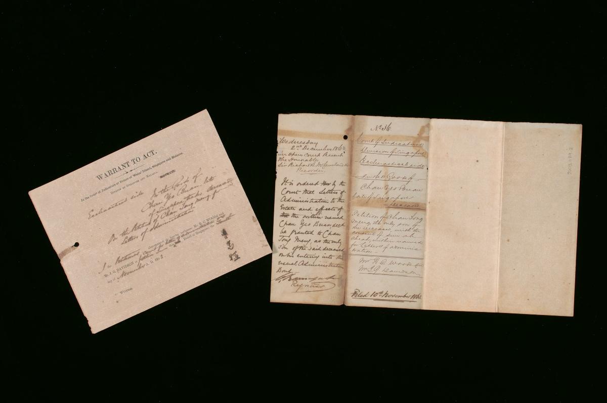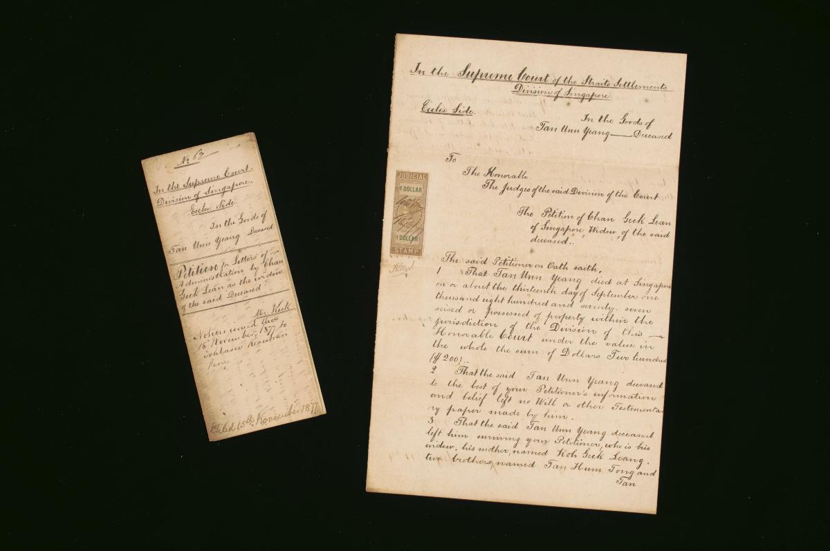 This is the petition of Chan Tong Meng concerning the administration of the estate of Chan Yeo Buan. It is part of a collection of legal documents from the 19th and early 20th centuries which provides a glimpse into the work of the notable personalities who left their mark on Singapore’s legal history, and the economic and other transactions undertaken by ordinary immigrants in 19th century Singapore that tell stories of misfortune and indebtedness which would otherwise have disappeared from history.
