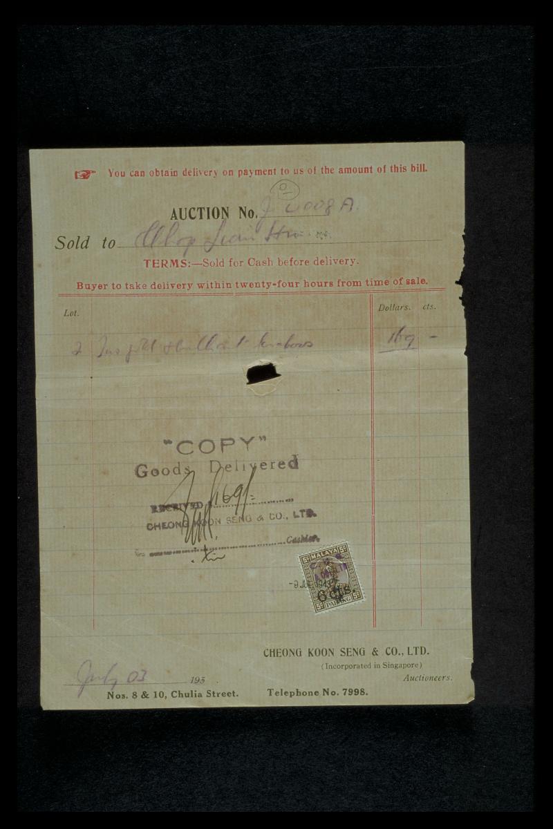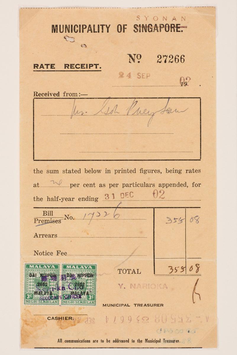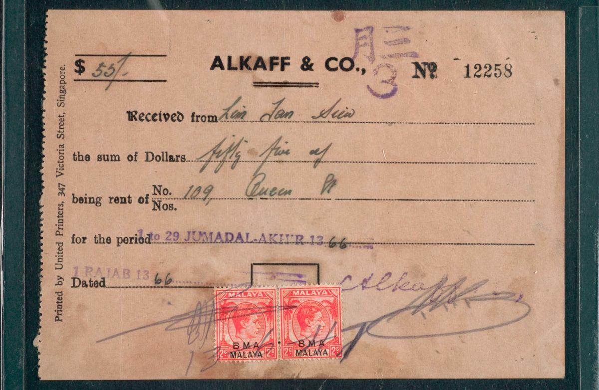 This is a receipt issued for the payment of rent to Alkaff & Company for a property at 109 Queen Street in Singapore. The company was established by businessman Syed Shaik bin Abdulrahman Alkaff, who migrated from Hadhramaut, Yemen, to Singapore in 1852. Besides the property business, the company also traded in sugar, spices, coffee, and other commodities.