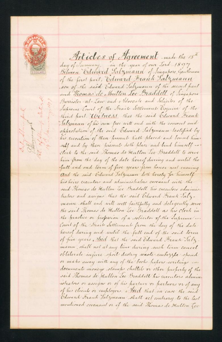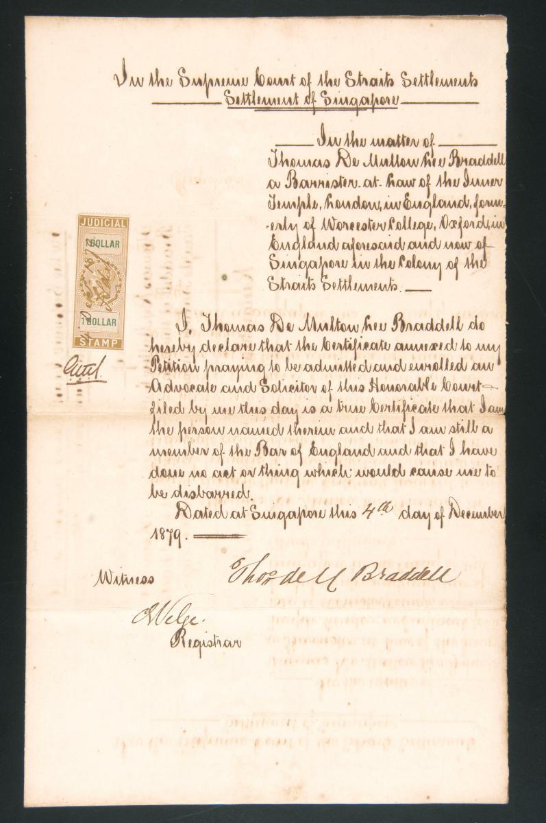 This is the petition of Thomas De Multon Lee Braddell filed on 4 December 1879 for admission as a solicitor and advocate to the Supreme Court of the Straits Settlements. It is part of a collection of legal documents from the 19th and early 20th centuries which provides a glimpse into the work of the notable personalities who left their mark on Singapore’s legal history, and the economic and other transactions undertaken by ordinary immigrants in 19th century Singapore that tell stories of misfortune and indebtedness which would otherwise have disappeared from history.
