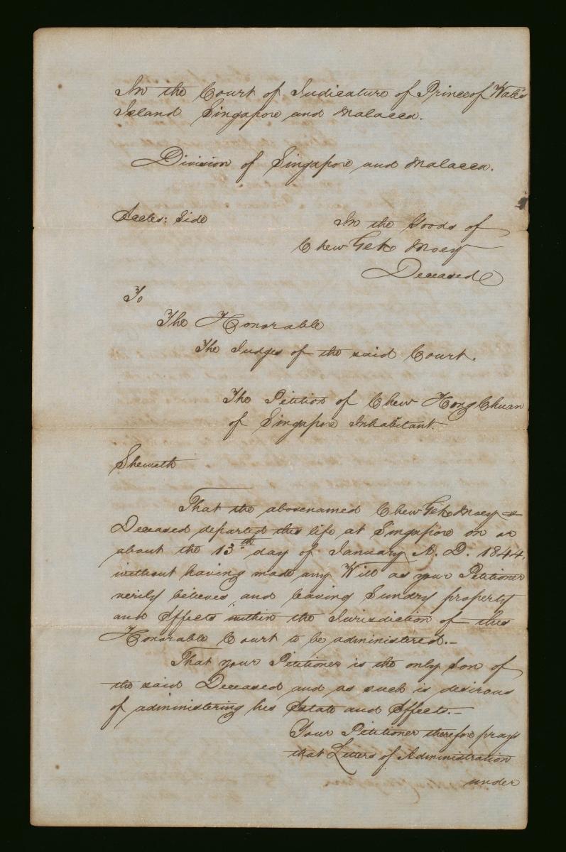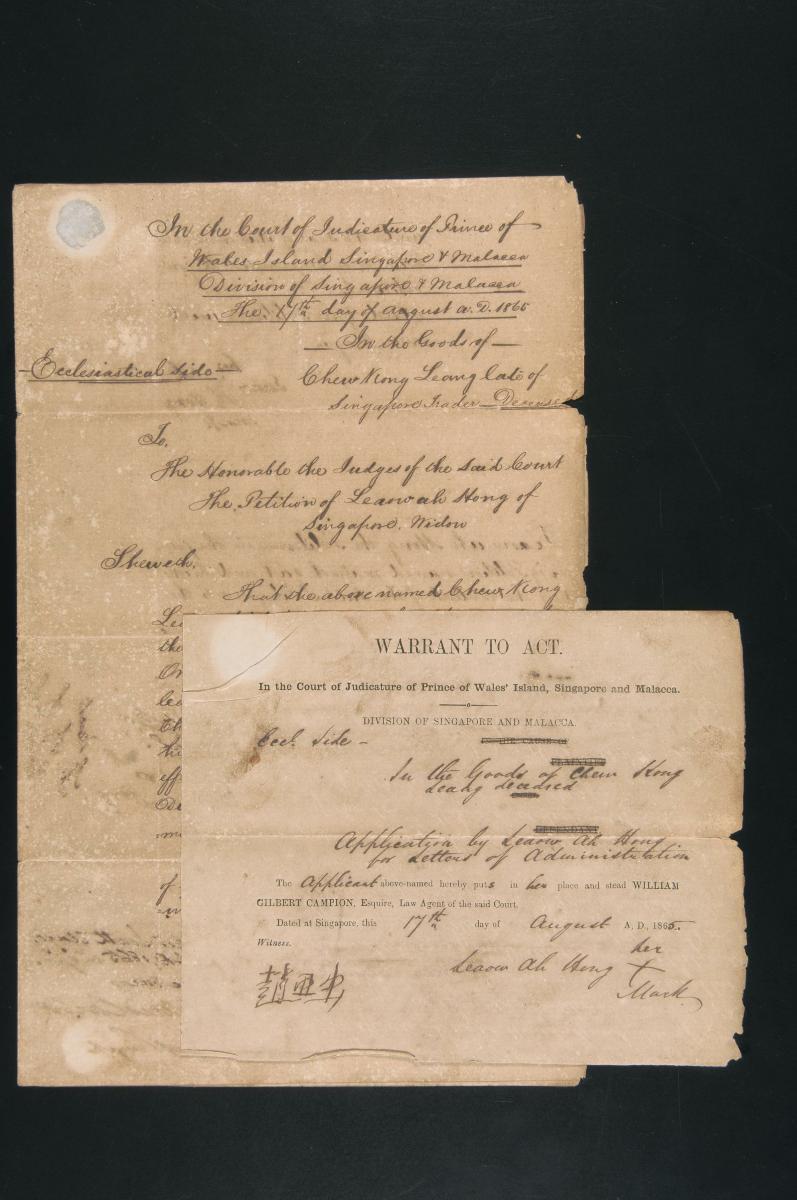 This is the petition of Leaow Ah Hong issued on 17 August 1865 concerning the administration of the estate of Chew Kong Seang. It is part of a collection of legal documents from the 19th and early 20th centuries which provides a glimpse into the work of the notable personalities who left their mark on Singapore’s legal history, and the economic and other transactions undertaken by ordinary immigrants in 19th century Singapore that tell stories of misfortune and indebtedness which would otherwise have disappeared from history.