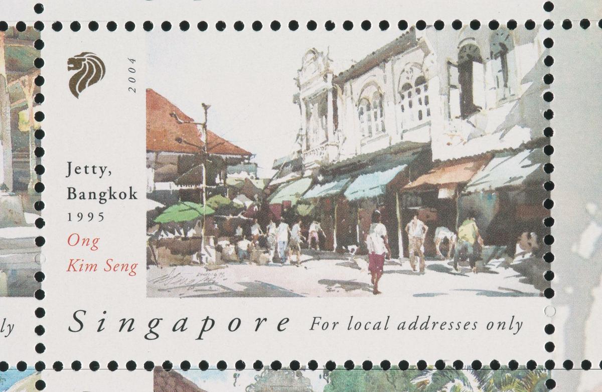 A stamp featuring 'Jetty, Bangkok, 1995' by Ong Kim Seng