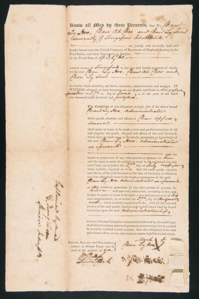 This is the administration bond of Goh Loo, Soon Hin, and Yeo Keng Tok made on 11 November 1843 concerning the administration of the estate of the deceased Goh Moh. It is part of a collection of legal documents from the 19th and early 20th centuries which provides a glimpse into the work of the notable personalities who left their mark on Singapore’s legal history, and the economic and other transactions undertaken by ordinary immigrants in 19th century Singapore that tell stories of misfortune and indebtedness which would otherwise have disappeared from history.