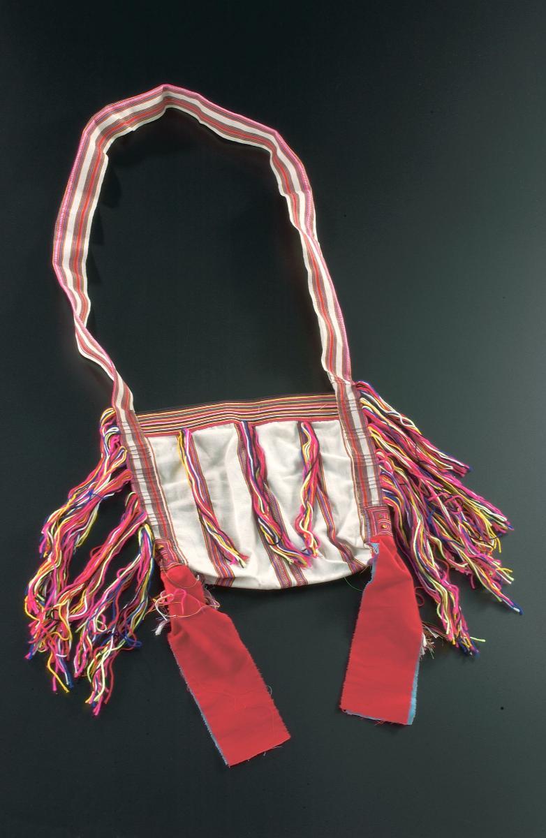 Lisu men and women carry multicoloured bags. The shoulder bags are made of hand-woven white or unbleached cotton threads and consist of vertical strips of red and various other colours. Work bags, like this piece, have 'red ears' or strips of cloth attached to the sides at the bottom, which represesnt the owner's taste and personality. A young Lisu man's 'courting bag' is an elaborate affair with strips of colourful embroidered cloths and threads that suspend from the sides and the bottom of the bag.